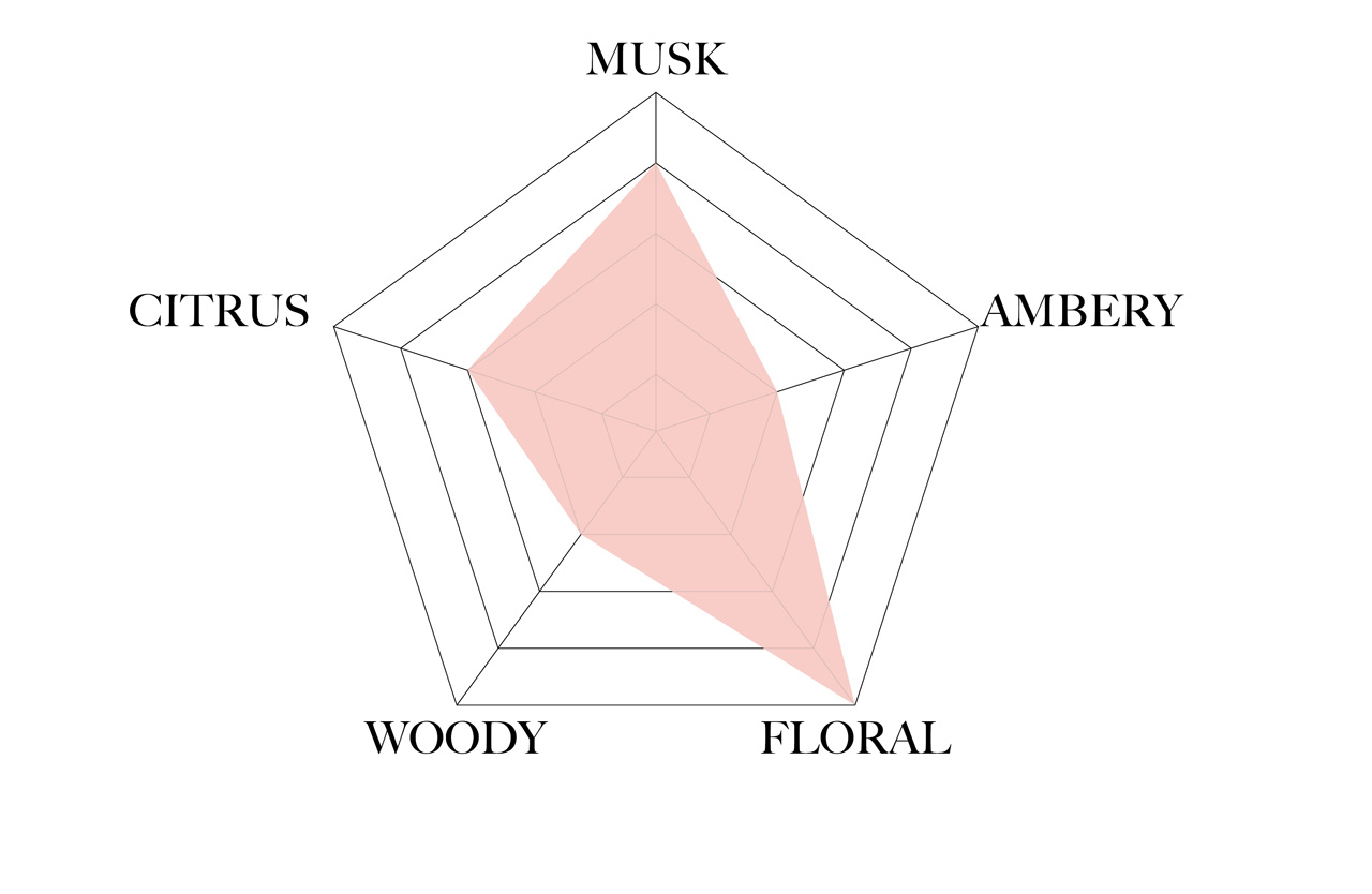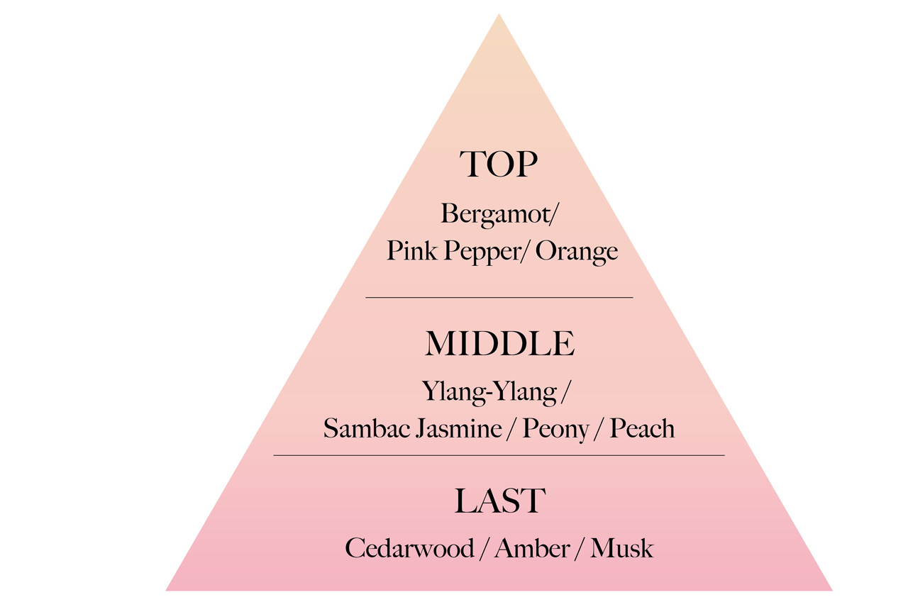 みずみずしく可憐なピオニーが咲き誇るように香り立ち、やわらかなフローラルが軽やかに広がると、ピーチのほのかに甘いニュアンスと溶け合いながら、シダーウッドとムスクのしなやかな余韻が肌に残るフローラルオリエンタルノート。
