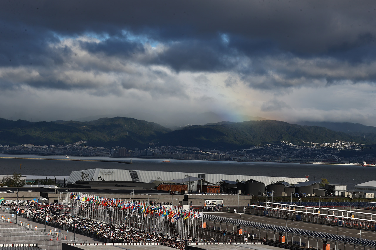 午前7時30分、遠くの山には虹がかかるなか出展・運営関係者が1500人から2000人ほどが参加する『フレンドシップリング』。各パビリオンからは約10人ずつが大屋根リングにあがる。