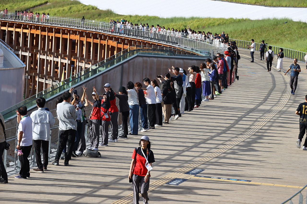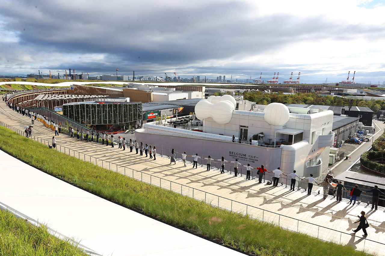 伝統衣装を着用している方や、マスコットなどさまざまな方が大屋根リング上に姿を見せる。そして各々が手を繋いでいき、大屋根リングが人の手つなぎによって1周する光景が完成……とはいかなかったが、スタッフの方たちは思い思いに手を繋いだり、報道各社が空撮しているヘリコプターに手を振ったりと、楽しんでいる様子を見せた。
