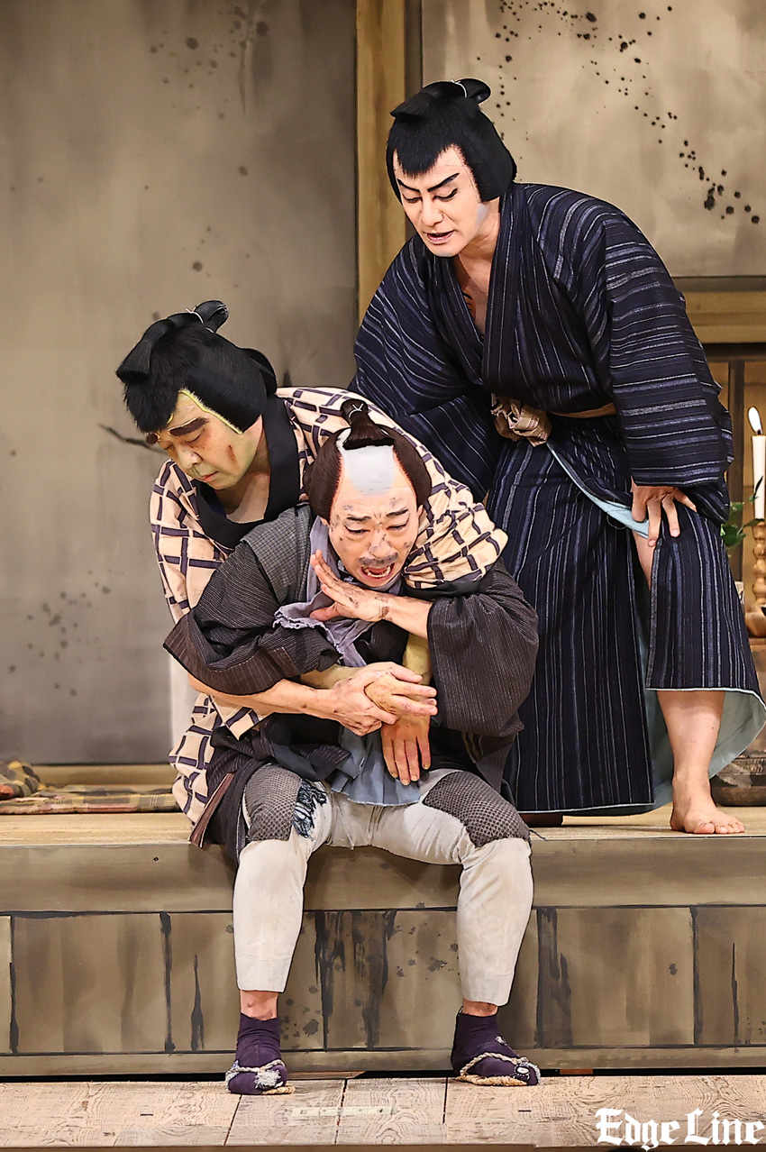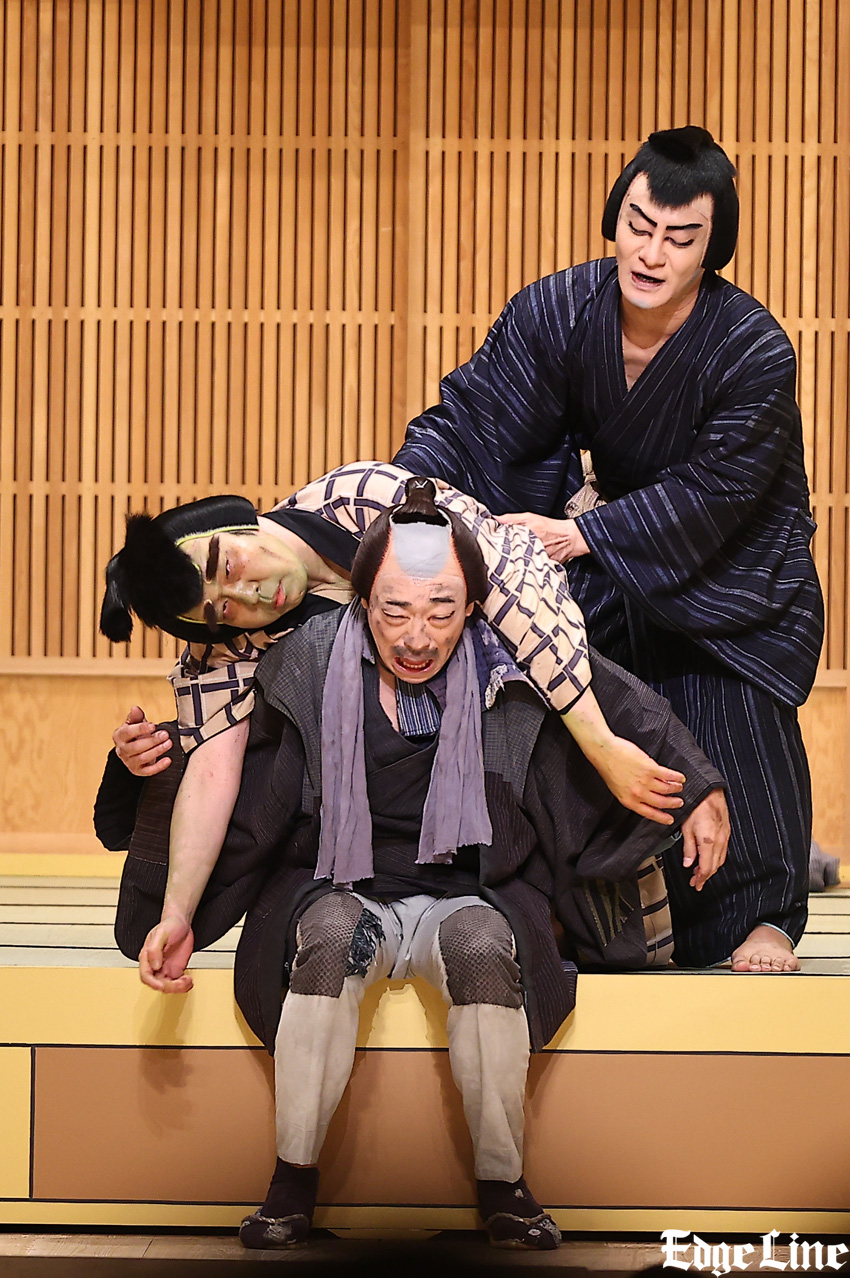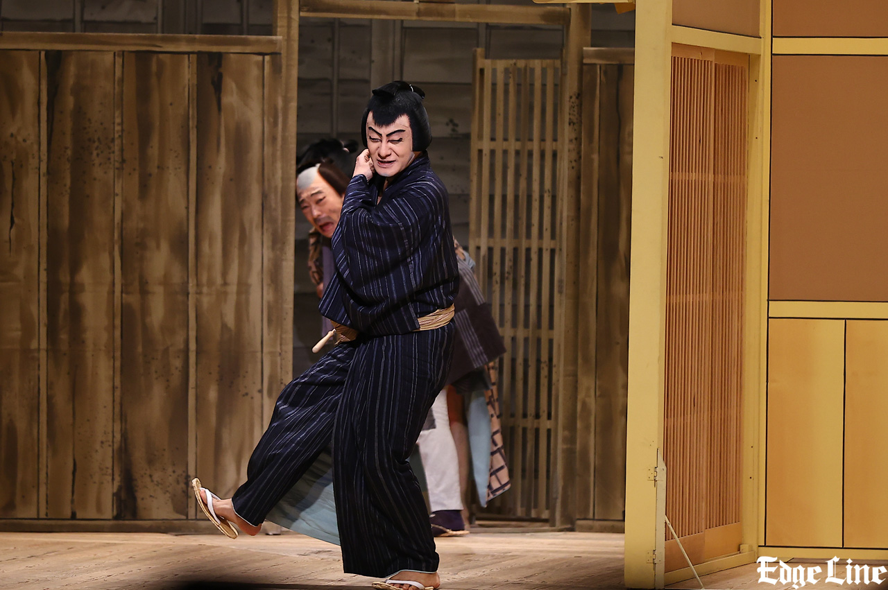 昼の部の最後を飾る『らくだ』は上方落語の大ネタで、歌舞伎の演目になっている。片岡愛之助演じるやくざ者の“やたけたの熊五郎”と、市川中車演じる紙屑屋の久六が、河豚(フグ)の毒に当たって亡くなった“らくだの宇之助”の弔いのために一芝居打つ。粗暴な熊五郎とおどおどしている小心者の久六。とある出来事から熊五郎と久六の立場がまるで逆にもなり、そのコミカルな掛け合いに、客席からは度々笑いが起こる。『道成寺』もさりげなく組み込まれており、観客を楽しませる要素盛りだくさんの舞台となった。