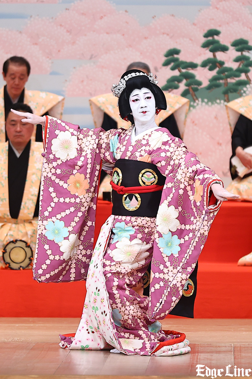 新春にあわせたように春が来たかのようなまばゆいばかりの背景美術。さらに、壱太郎が数々の衣装替えとともに華麗に数十分にわたって舞い踊り続ける舞台で、『壽 初春歌舞伎特別公演』夜の部の締めくくりを華やかに彩った。