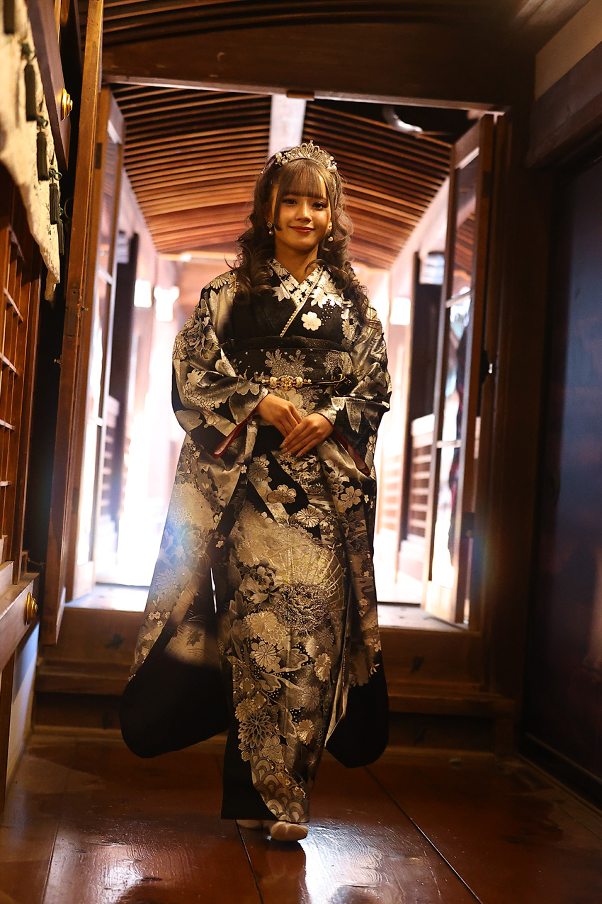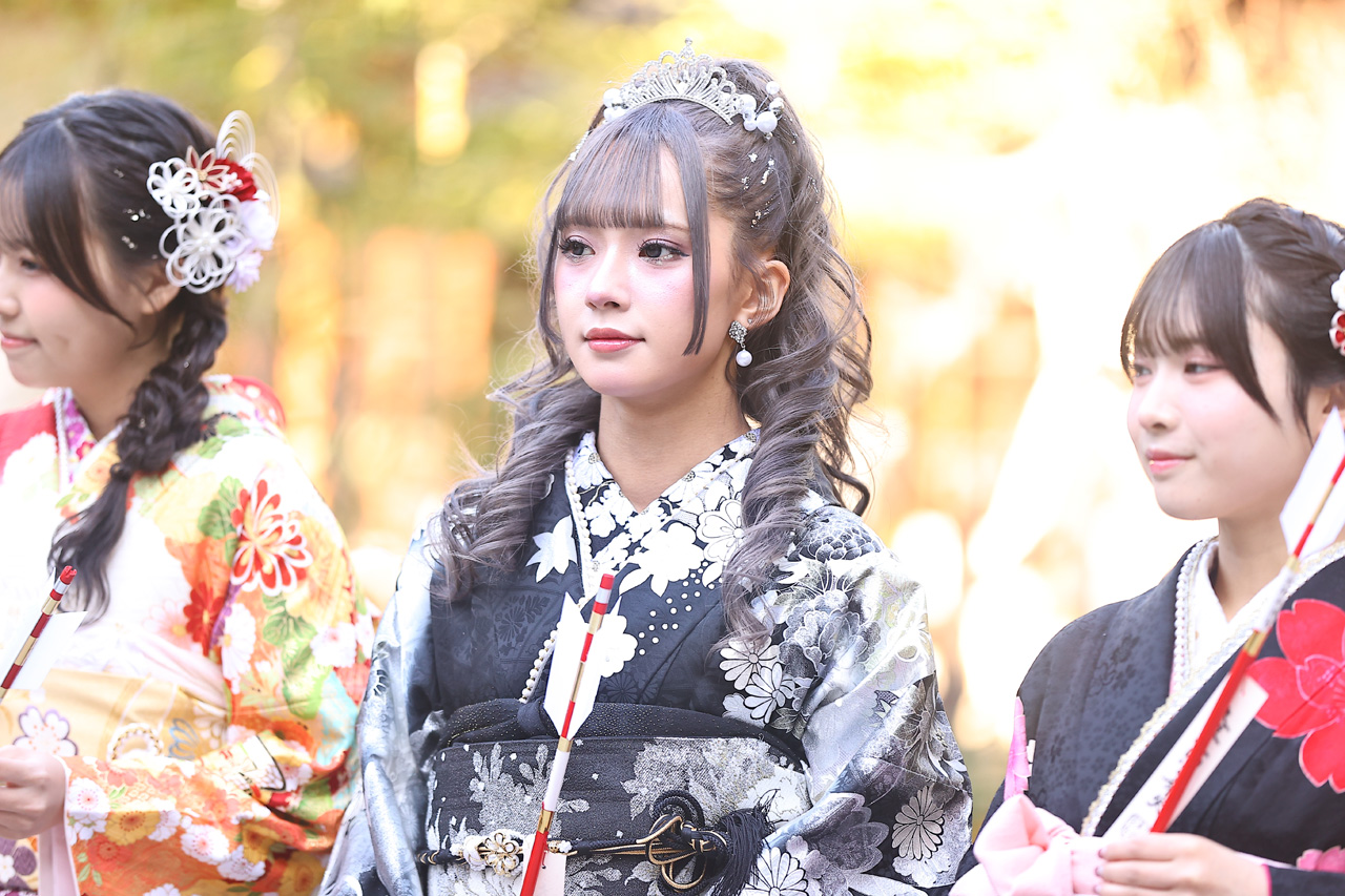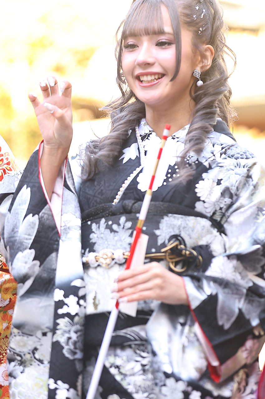 あでやかな振袖姿を披露した池田。本日の衣装やコーディネートのポイントとして「頭から爪先まで黒とシルバーでそろえて、ネイルも超可愛い感じに仕上げていただいて、いかにも『ギャル感』を出させていただいています」と、ネイルもあわせてしっかりと見せた。
