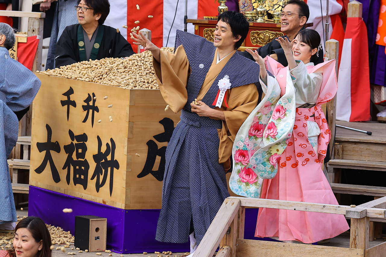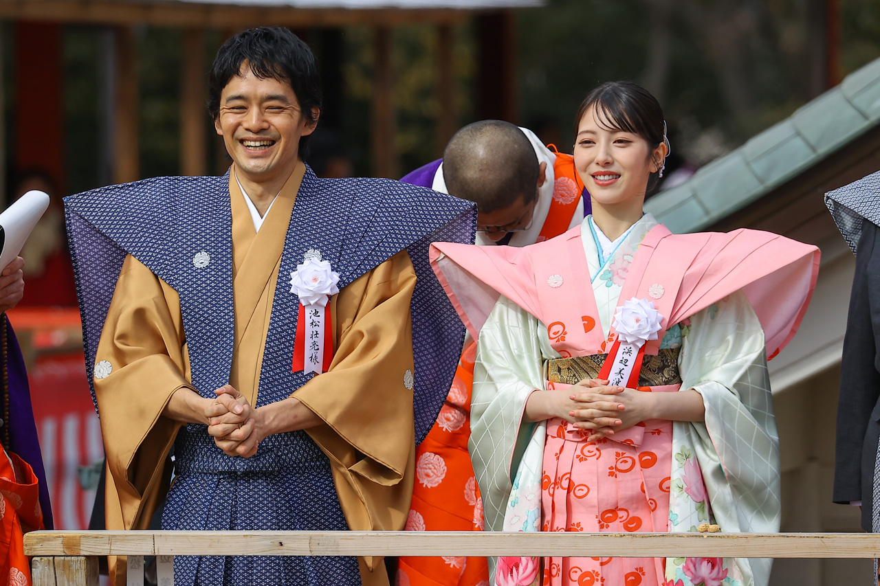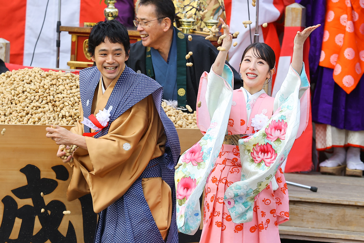 『成田山節分祭』では、毎年芸能人がゲスト参加しており、2025年は連続テレビ小説『おむすび』のキャストが登場するなど盛り上がった。今年は大河ドラマ『豊臣兄弟!』出演者が登場。後の豊臣秀吉となる木下藤吉郎秀吉役を演じる池松と、後の秀吉の正室となる寧々役の浜辺が出演となった。