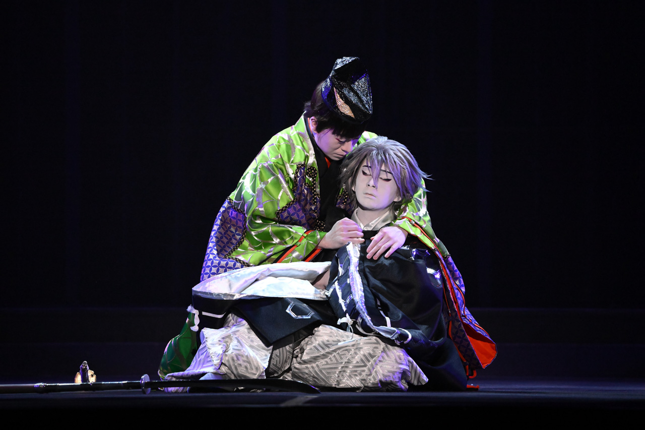 やがてスクリーンに地球と月が映し出されると、その中央から渚カヲル(尾上左近)が静かに降臨!万雷の拍手の中、静かに佇み、愁いを湛えて舞い踊る──その一挙手一投足のあまりの美しさに、会場中が息を呑んだ。続いて、紅き海を背に烏帽子姿の碇シンジ(上村吉太朗)が登場。ついに運命の邂逅を果たした二人は、笛と鼓を響き合わせ、連れ舞をする。邦楽のオーケストラのしらべに乗せて情緒豊かに描かれる、二人の通い合う心。ファンにはたまらない至高の演出に、会場全体が深く酔いしれた。