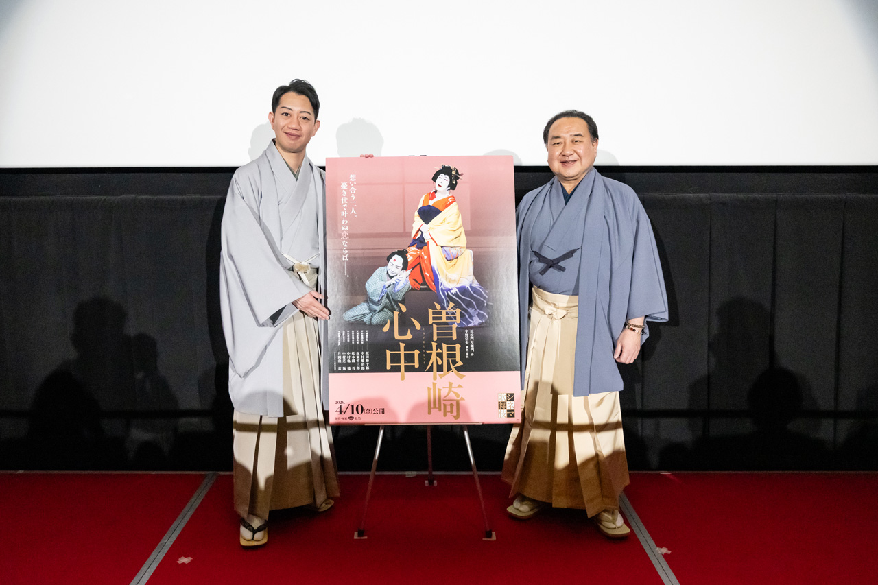 歌舞伎俳優・中村鴈治郎と中村壱太郎父子が3月23日に京都・MOVIX 京都でシネマ歌舞伎『曽根崎心中』(脚色・演出:宇野信夫/配給:松竹)舞台あいさつ付完成披露上映会に登壇した。