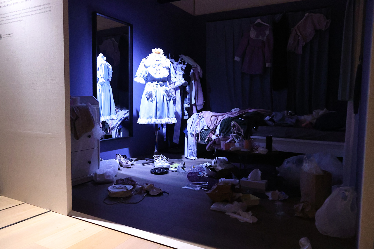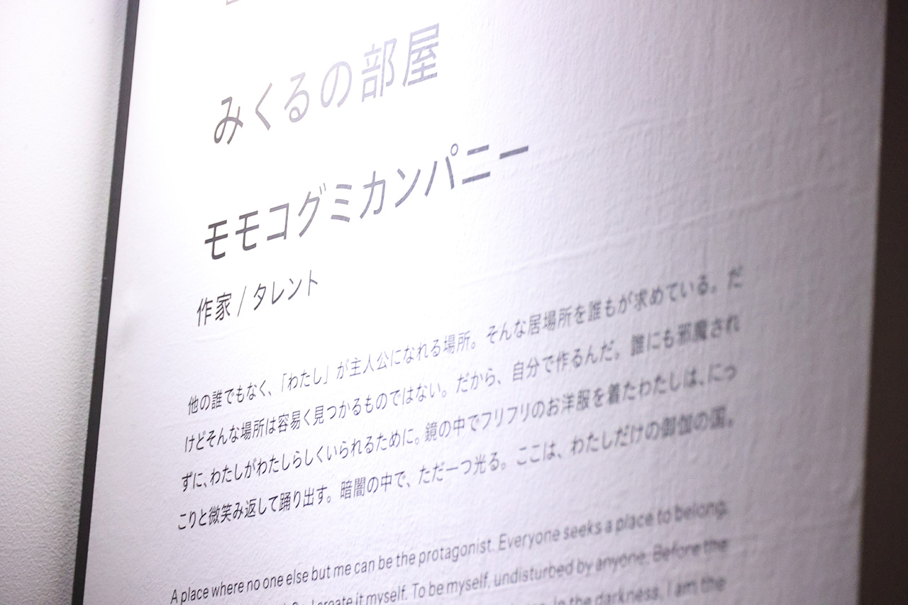 モモコは『異世界も楽しむ』に出展しており『みくるの部屋』と題した部屋を作り上げた。オファーが来たときに「正直家具とかに執着やこだわりがなくて適当に暮らしてきたなと思っていたんですけど、作りたい部屋だったら……」と思い浮かべたのが、自身の初小説『御伽の国のみくる』に登場した主人公・友美だったそうで、「友美ちゃんはアイドルを目指しているけど働いているけど、メイド喫茶でもんもんとして過ごしているという設定なんです。原作を読んでいなくても、女の子の綺麗になりたい、可愛くなりたいという気持ちで、きょうも頑張ろうって生きている感じがある半面、“愛されたい”“可愛くなりたい”で壊されていってしまうものがたくさんあるなと思って」という心境を説明しつつ、部屋の表現としては、「部屋の中でも一筋のライトの光が可愛いドレスだけ照らしていてあとは全部陰っているんです。ゴミとか、化粧品が散乱していたりとか、菓子パンのゴミとか広がーってげられりとか。SNSを見ると女の子の可愛い部分、完成された部分がクローズアップされがちですけど、カワイイの裏側や闇を表現したくて」とコンセプトを。