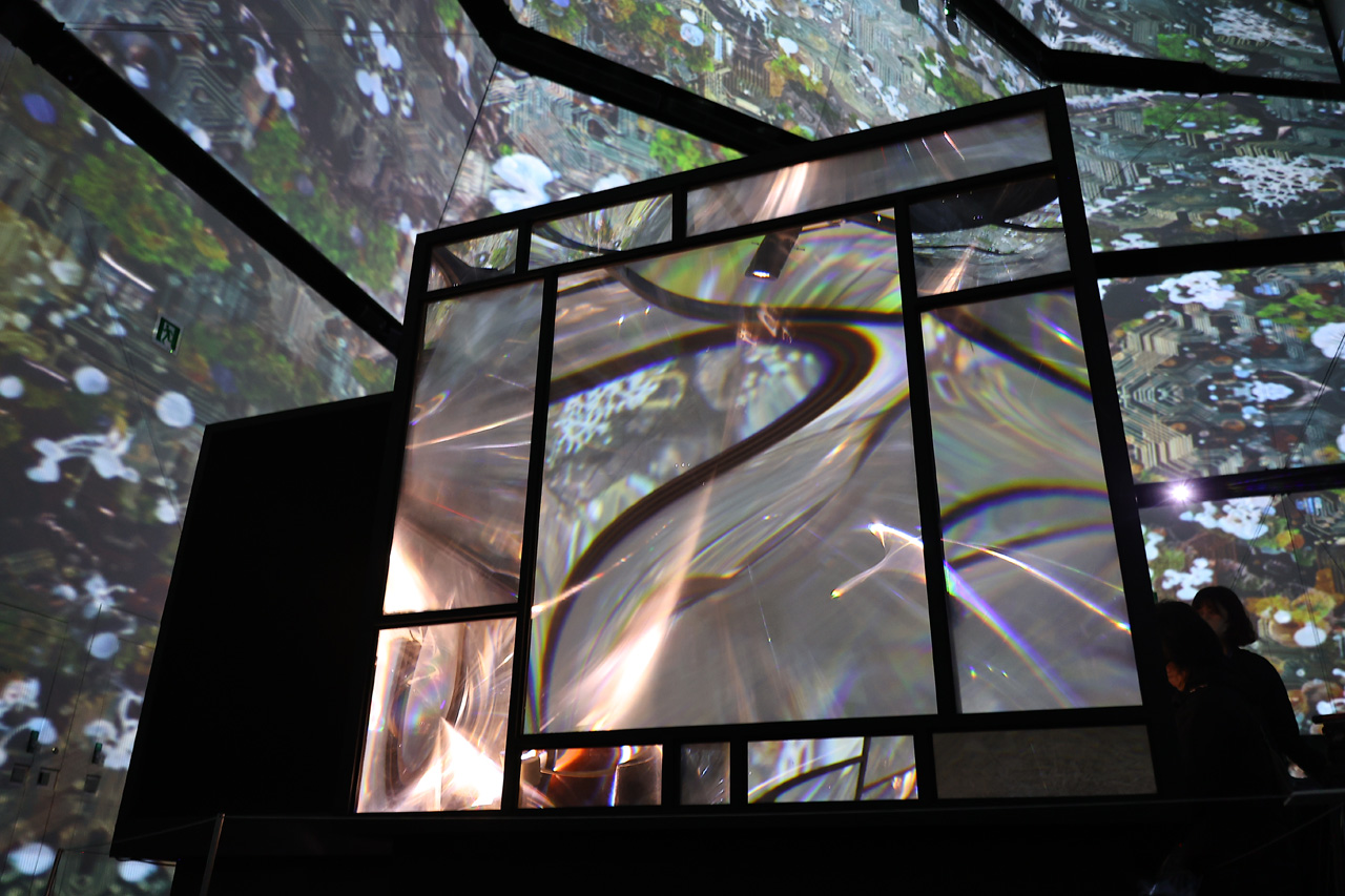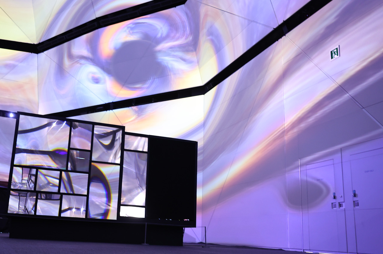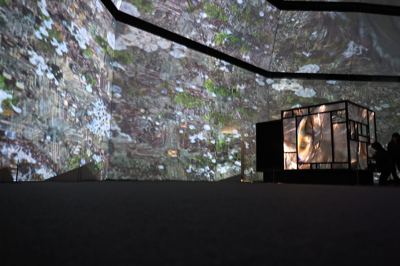 『即今叢:計算機自然の蒸留と発酵』については、『ヌル庵:騒即是寂∽寂即是騒』の設置している大部屋自体をプロジェクションマッピングで包んだものとなっており「お庭的」だそうだが、周囲の風景も変わっていくんと面白いかなと思って。会期中もAIが周囲の風景を変えたり、アップデートしていくので、リアルタイムで風景を生成し続けるので割とゆっくり見れるかなって」と、明かしていた。