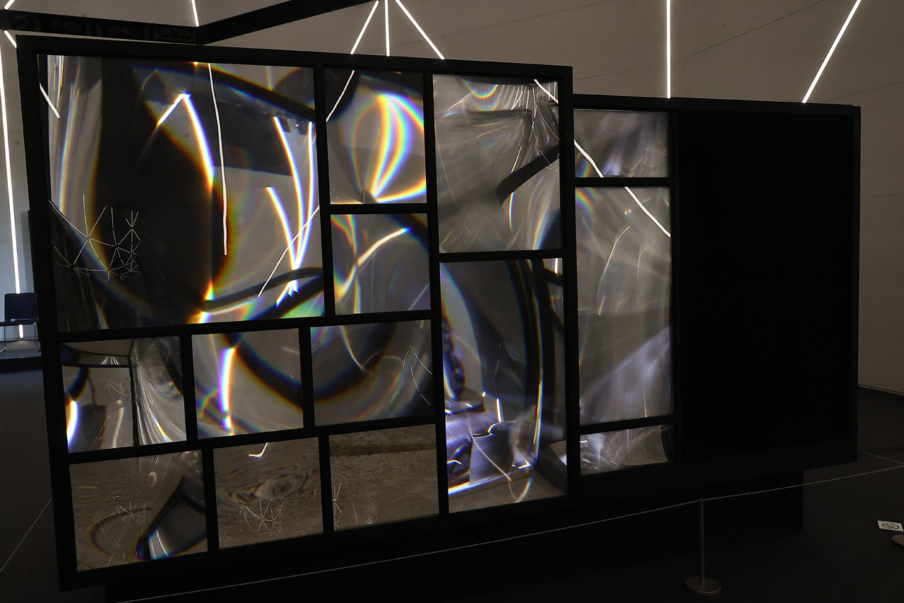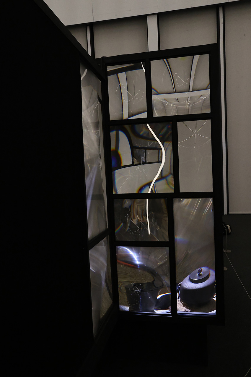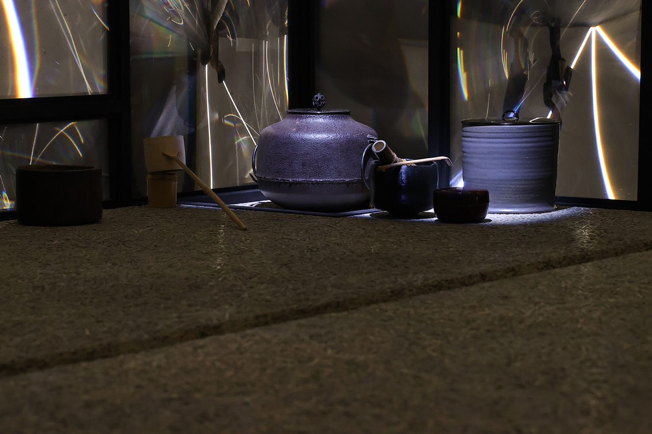 その内部はヌルヌル内にもあった落合氏のライフワークという茶室。「茶室がある実家に育って、大人になってお茶も習うことがあって。茶室は釜がないといけないとか大軸がないといけないとか、総合芸術として面白いんです」と、茶室の魅力を語りつつ、「お軸がなくて、鏡面膜でできていて、鏡が動きながらヌルヌルと、床の間を映したりとかしながら変わっていきます」と、部屋のコンセプトを。