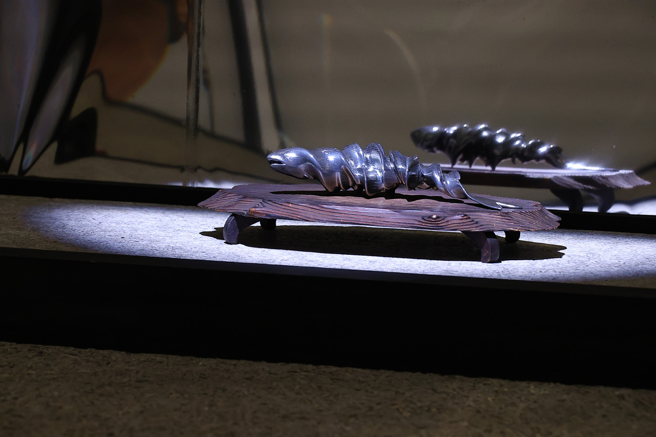 ちなみに中に鮎の置物も展示しているが、これは「私アユ食べるのも好きですし彫刻にするのも割と好きなので」と話す。すると山本氏がアユについて興味を示し質問すると、「作り方が特殊なんです。まず、アユを3Dで作るところまでこっちでやって、今回参加されているカリモクさんの機材を使ってアユを削って。そのあと、ヒレとかを飛騨の木工職人さんにこう削ってもらって。超薄くなったところでもう一回それを3Dスキャンして、カリモクさんの機材で塗装するっていうすごく循環的なプロセスで作ってるんです。なんか独特なフォルムが出るようになってきていいんですよ」と、解説もしていた。さらに、茶碗については、楽焼きを以前スキャンしたことがあり、それを許可をもらって3Dプリンターで再現したものだという。「一手間二手間三手間ぐらいだいたいのお道具にかかっております」とのことだった。