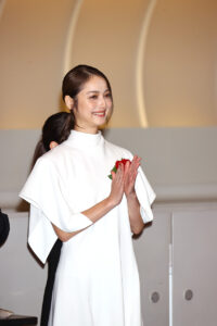 同社社員らが見守るなか、白のドレスで胸元に赤いバラをさし登場した佐々木。代表取締役社長の龍川誠氏と談笑をしたり、龍川贈呈通知書贈呈される際には惜しみない拍手でお祝いしていた。