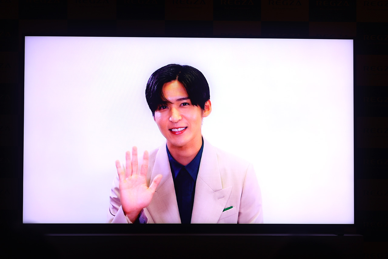メッセージムービーで、目黒は「レグザ、グローバルアンバサダーの目黒蓮です。このたびレグザ史上最大の110インチの大画面TVをはじめとする大画面シリーズが発売になります。コンセプトは『見たいものだけ、好きなだけ、もっとそばに』ということで、この大画面レグザは出ている役者さんの息遣いまでリアルに感じることができたりします。ライブでも、その場で実際にライブを楽しんでいるような臨場感の映像をお届けできるようになっていると思います」と、製品アピールを。