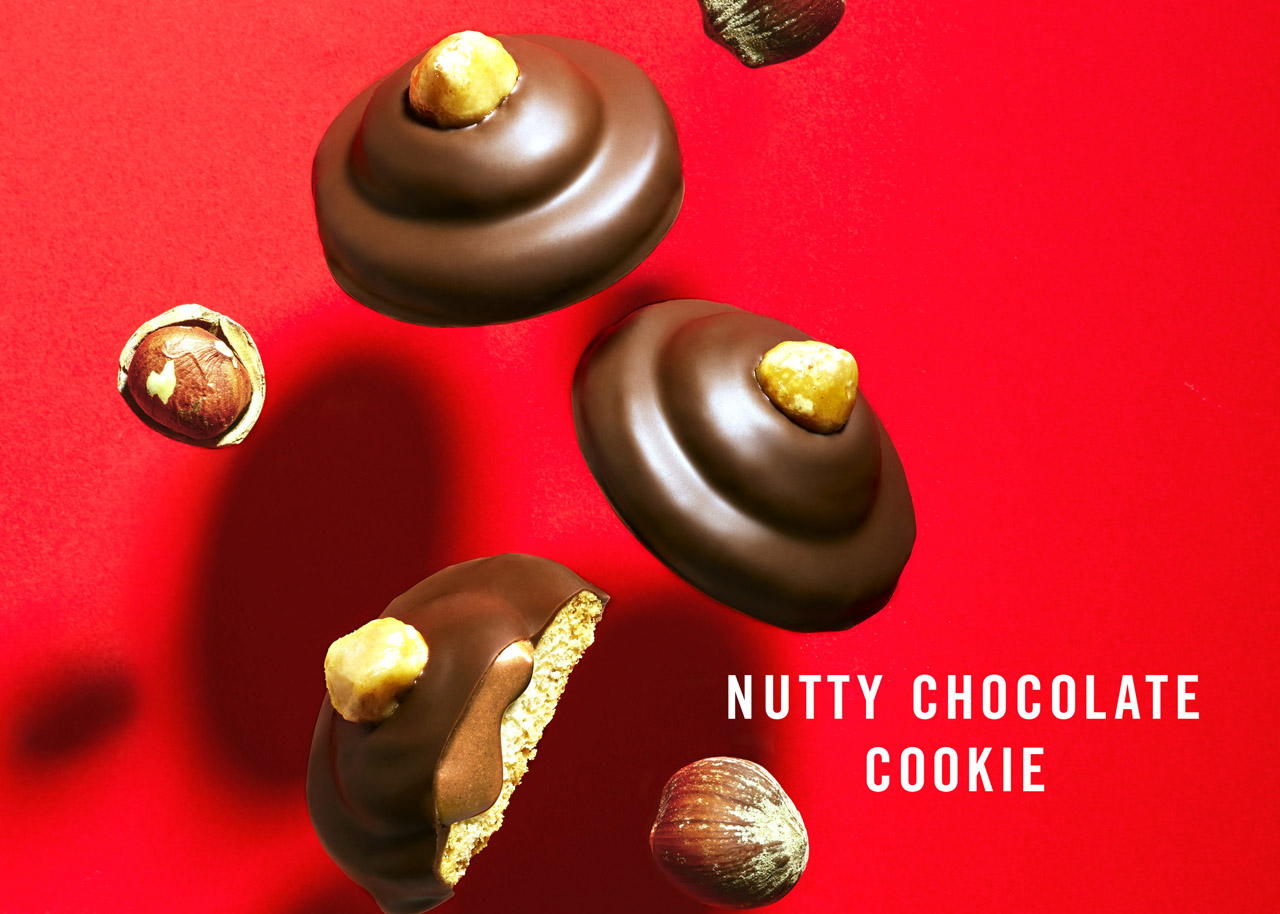 赤い袋が目を引く『ナッティーショコラクッキー』は、封を切った瞬間に広がるナッツの香りがまず印象的。口に入れた瞬間にとろける濃厚なジャンドゥーヤクリームと、ザクザク食感のクッキーが絶妙で、ザクザクに砕かれたクッキーのひとつひとつにとろけたクリームとコーティングされていたミルククーベルチュールチョコレートが浸透していく感じだ。まるで帽子のように愛らしくトッピングされた一粒のヘーゼルナッツをガリッといくと、また、ナッツの香りが広がっていく。ぜい沢で濃厚な美味しさが楽しめます。