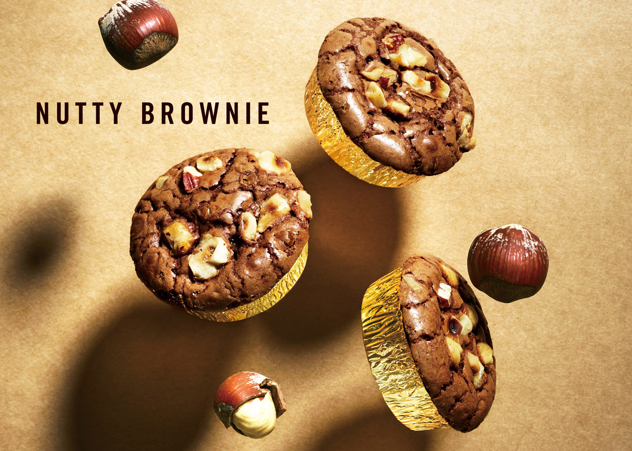 透明な袋と金の包み紙が印象的な『ナッティーブラウニー』は、ジャンドゥーヤとクーベルチュール チョコレートの2種類のショコラから生まれるナッティーでぜい沢な味わい。生地に生クリームを加えることで、外側は”サックリ”、中は”しっとり”に焼き上げた。ローストナッツのトッピングでカリッとアクセントをきかせている。