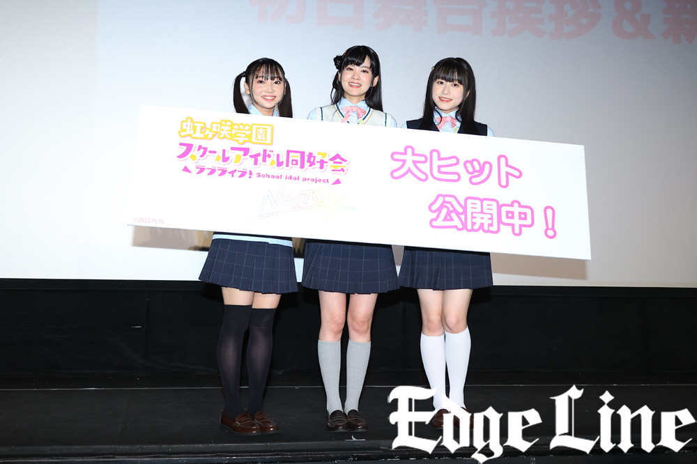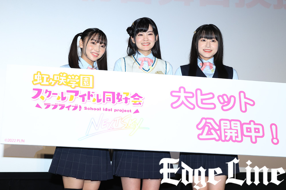 OVA『ラブライブ!虹ヶ咲学園スクールアイドル同好会 NEXT SKY』(監督:河村智之/配給:バンダイナムコフィルムワークス)初日舞台あいさつ&新情報発表会が23日、東京・台場のユナイテッド・シネマ アクアシティお台場で開かれ“ニジガク”の愛称で親しまれる『虹ヶ咲学園スクールアイドル同好会』から高咲侑役の矢野妃菜喜、上原歩夢役の大西亜玖璃、優木せつ菜役の林鼓子が登壇した。