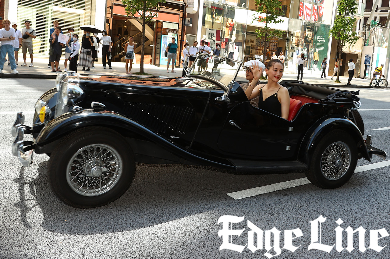 綾瀬は最後方のMG TD1951年式に、胸元バックリの黒ドレス姿で登場。車から降りてニコニコと手を振って、到着をアピールしていた。