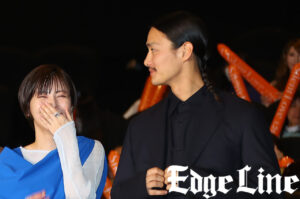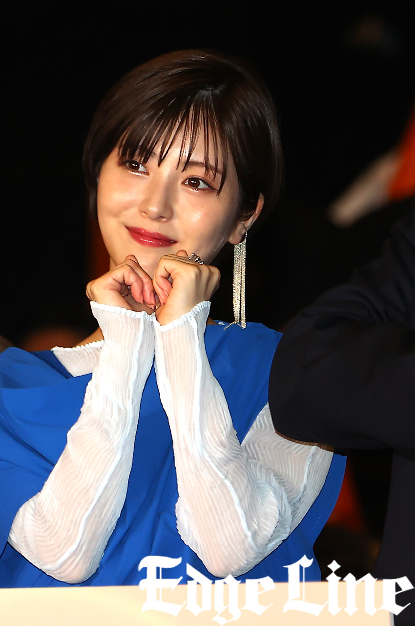 記念撮影は観客たちをバックに特効も入る派手なものに。その写真撮影の際にカメラマンたちから、作品の“LOVE”にちなんで手や指で「ハートでください」とリクエストが。これに浜辺は気恥ずかしかったのか、しばらくはにかむように笑っていたが、ほかの4人が積極的にしているのを見たからか、自身もハートをいくつかのバリエーションで見せて、笑顔の花が咲くものとなっていた。