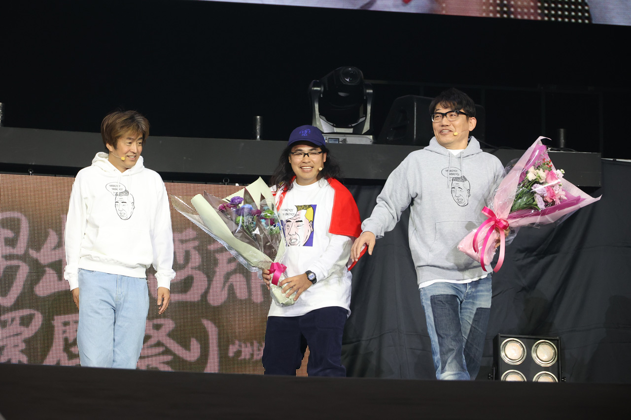 総合司会の内村光良、大会委員長の南原清隆の2人が、ファンファーレが鳴り響く会場に登場すると、大歓声が巻き起こった。「たった1人の男の還暦祝いのために集まってくださって、本当にありがとうございます!」と集まった観客にお礼を述べた2人。そんな2人は出川とは40年来の仲で、「ここ、横浜で出会って40年。感慨深い…!」と記念すべき日を祝えたことを喜んだ。