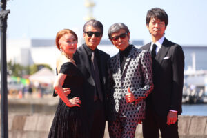 開演前にはこれまでの作品の懐かしの楽曲たちが流れており、会場には日産のレパードとハーレーが設置され雰囲気は満点。さらには、レッドカーペットのバックには、赤レンガ倉庫も見えており、“ハマ”感も満載。そんななか、抽選で選ばれた約200人もスタンバイしており、4人が到着した瞬間、「おおっ!」とどよめきが起こる様子も。そこからレッドカーペットを歩く4人を撮影し大歓声を浴びた。