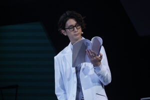 幕が上がり、壇上に現れたのは白衣をまとった湯川(江口拓也)とスーツ姿の草薙(仲村宗悟)。第一章『燃える』の物語は、湯川の元に草薙が世間を騒がせている焼死事件の解決の協力を仰ぎに来るところから始まります。事件の舞台は閑静な住宅街、とあるバス停のベンチでたむろしていた若者のうちの一人が突然頭から発火し焼死した……という不可解な事件が発生。