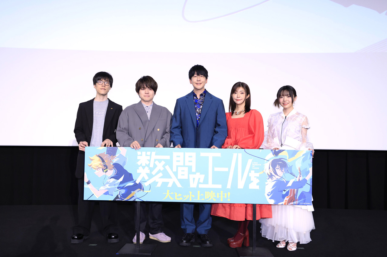 オリジナル劇場アニメーション『数分間のエールを』(監督:ぽぷりか/配給:バンダイナムコフィルムワークス)公開記念舞台あいさつが6月16日に東京・TOHOシネマズ新宿で開催され朝屋彼方役の花江夏樹、織重夕役の伊瀬茉莉也、外崎大輔役の内田雄馬、中川萠美役の和泉風花、ぽぷりか監督が登壇した。
