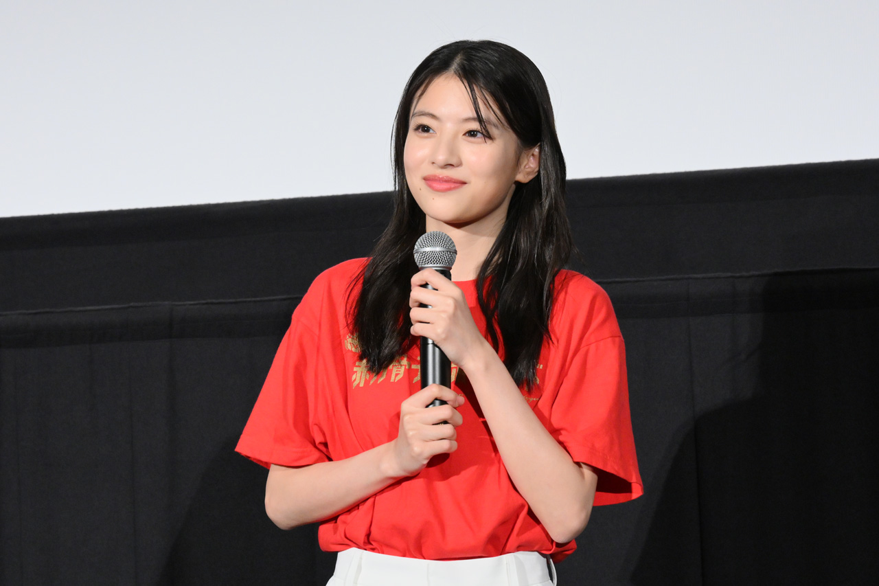 公開から約1か月が経ったこの日、登壇したのは、100億円の懸賞金をかけられたヒロイン赤羽骨子を演じた出口夏希と、骨子の親友で空手家の棘屋寧役の髙橋ひかる。満席の会場に登場した出口は「今日はよろしくお願いします!」、髙橋は「今日は最後の舞台挨拶なので、皆さんに楽しんでもらえるように頑張っていきます!」と気合を入れ、元気よく挨拶した。