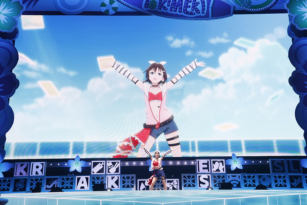 ステージは映画の舞台・沖縄を意識したような花やイラストなどが装飾され南国な雰囲気満点!開演時間となるとステージ上部の大モニターにメンバーが横一列で映し出されるなか、ステージにはメンバーと同じ並びでアロハ風衣装なキャスト陣がラインアップ。手振りまでメンバーたちキャストがシンクロするなか、全員楽曲『Just Believe!!!』から幕開け。花火演出も交えた派手なステージで、観客たちを一気に熱狂の渦へと引き込んだ。