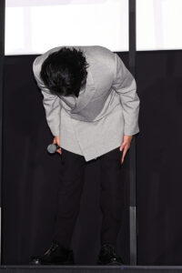 そして藤井監督は『武士』として「10代から見ていて、侍のような魂で“ちょっとはサボりなさいよ”って思うくらい真面目。ちょっとは休んでほしいというくらいストイックで。でも目指すものがあるからだろうなって思って」と、目を細めて話す。ここで5人の思いを受け止めての感想を振られた横浜だったが、大汗が吹き出たことに横浜が「汗の水かもしれない!」というと、山田孝之も1歩前に出て「正解!」と告げる、どこかコミカルな瞬間が。