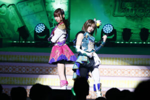 続くシオン(山北早紀)・レオナ(若井友希)の「CHANGE! MY WORLD」ではレオナの「ヨコパマ!まだまだいけるよねー!」の呼びかけにファンも声を出して一緒に盛り上がります。ライブが始まると2人はステージから客席へと降り立ち、通路を練り歩きながら歌唱。観客の目を見ながらコミュニケーションを取ったり、手を振るなどしながら観客たちを盛り上げます。