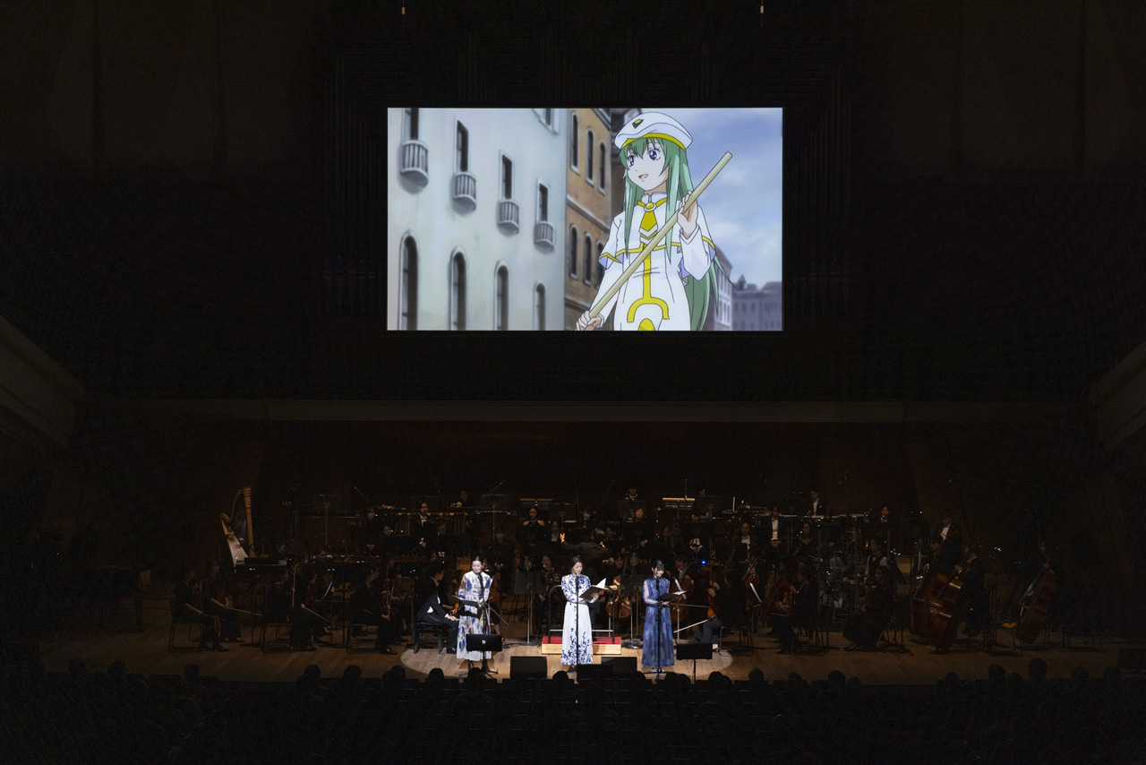 続いては、アニメ『ARIA』の放送開始20周年を記念し、『ARIA』のオーケストラコンサートでは初開催される生アフレコのコーナー。本公演では、3本のエピソードの生アフレコを披露予定で、最初の1本はアニメ化されていない原作のエピソード『Navigation64 休日』の予定でした。残念ながら、物語のメインとなる水無灯里役の葉月絵理乃さんは、体調不良により休演されたためアフレコは中止になりましたが、大きなスクリーンに映し出された天野こずえ先生の絵に合わせて、『入道雲の下で』『アリアの憂鬱』『追憶のドルチェ』が演奏されました。