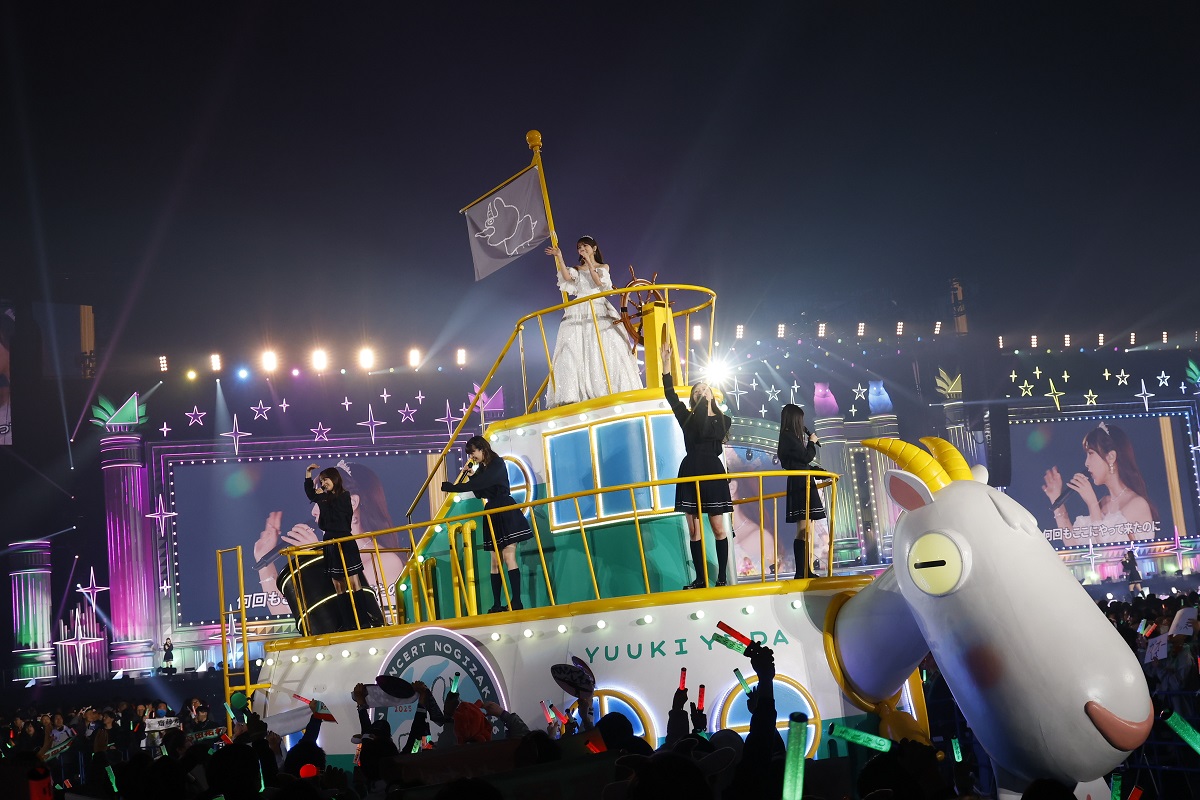 映像のエンディングで「逃げ水」のMV冒頭パートが映し出されると、それとリンクするように旅行カバンを手にした与田がサブステージに登場し、客席からは温かな拍手が送られる。そのままメンバーが待つメインステージまでゆっくりと歩き、全員と合流したところでカバンをテーブルに置き開いてみせる。すると、カバンの中からたくさんの思い出が溢れ出す演出とともに、ライブは彼女の初センター曲「逃げ水」からスタート。ドラマチックな曲調とともに客席の熱量が上昇していくと、以降も「ひと夏の長さより…」や「ロマンスのスタート」「あらかじめ語られるロマンス」「全部 夢のまま」と緩急に富んだ選曲や、ヤギを模した大型トロッコやフロートを用いた演出で観る者を大いに楽しませいく。