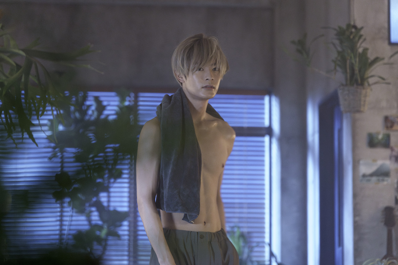 そんな塩野の場面写真は、細美のバキバキ腹筋のもの。少し思いつめたような表情の細美、上裸にパーカーを羽織っているがファスナー全開状態の姿で玄関を開けてしまう細美の表情も浮かべたものとなっている。