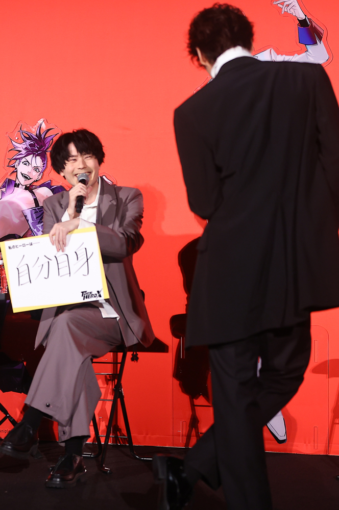『自分にとってのヒーローは?』という質問に答えるコーナーも開催。島﨑が“同期”と思っている松岡と内山の姿を見て自身がいつも奮い立っていると話していたが、その次に順番の回ってきた内山は『自分自身』とフリップにしたためおり宮野から「これだもんね」とイジられる。内山は「そういうことじゃないんです!」と、苦笑いを浮かべつつ「ヒーローを演じるときに、“自分最高”と思わないと肩を並べられない感じがするので、そういうときは自己肯定感マックスで、自分自身を鼓舞してるなって」と役作りのためにこうしたと明かしていた。