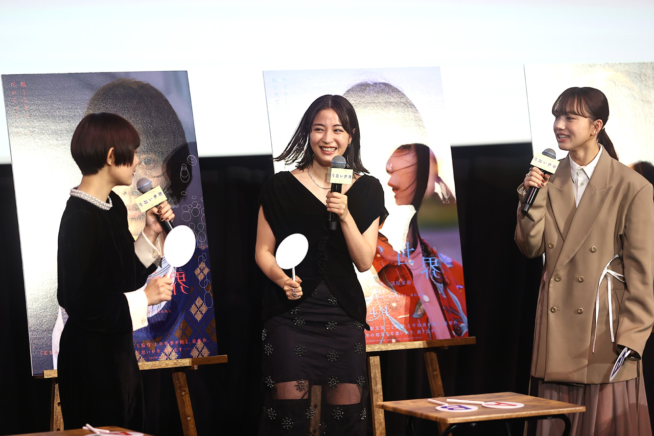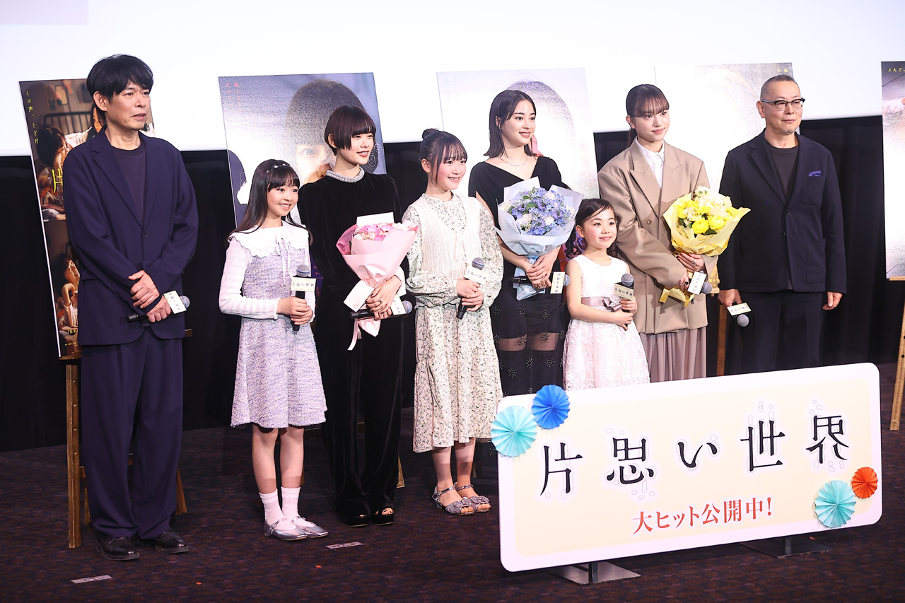 俳優・広瀬すず、杉咲花、清原果耶が4月5日に東京・TOHO シネマズ日比谷で映画『片思い世界』(監督:土井裕泰/配給:東京テアトル、リトルモア)公開記念舞台あいさつを土井監督、脚本家・坂元裕二氏とともに開いた。