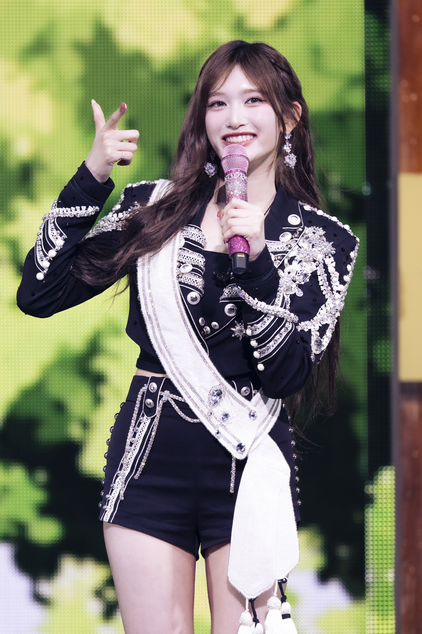 VCRを挟み、スペシャルなユニットステージへ。まずは水色と白ショートワンピースに着替えた魔法少女たちこと、ユジン、ガウル、レイ。ユジンは大きなリボン、ガウルはティアラ、そしてレイはメイド風のヘッドドレスを着けて、”Magic Girl”(Orange Caramel)を魔法少女さながら、変身スティックを振りながら最上級のキュートさで披露。続いてウォニョン、リズ、イソによる“Levitating”(Dua Lipa)がスタート。ジレ&パンツに眼鏡姿のウォニョン、スリーピースのパンツスーツのリズ、イソはジャケットにネクタイをゆるめに締め、ショートパンツにニーハイブーツというマニッシュな衣装に身を包み、カッコよさとセクシーさを纏ったステージで会場を魅了した。