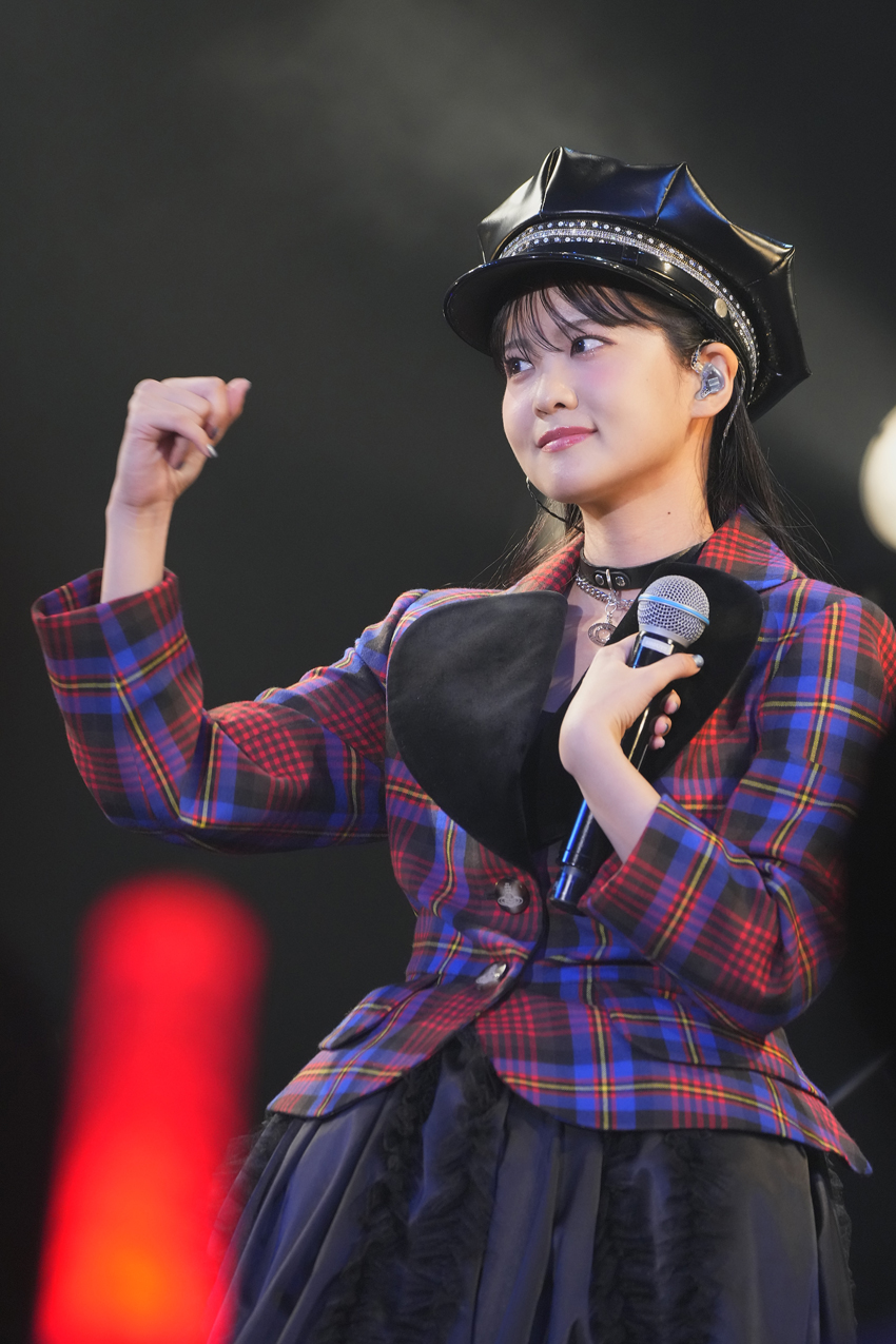 28日の公演は、『大西亜玖璃 3rd LIVE Rock&Roll Lady LIVE』。1stライブぶりの生バンド編成で、コンセプトミニアルバム『Rock&Roll Lady Girl』の世界を表現していく。衣装はポリスハットにチェック柄のジャケット。黒い大きな襟がハートに見えるのもクールでかわいらしい。まずは、TVアニメ『スライム倒して300年、知らないうちにレベルMAXになってました ~そのに~』のEDテーマ「イニミニマニモ」をぶちかまし、「NTMUエイリアン」へと繋げていく。前の2公演ともガラッと雰囲気が変わったライブ。彼女の楽曲にはアイドルソングやポップソングだけでなく、ロック調の楽曲も多いので、生バンドとの相性はバツグンだった。