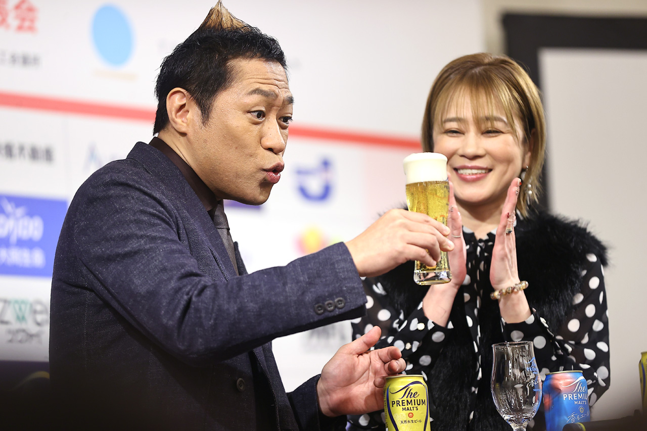 副賞としてサントリーからプレミアムモルツビールが振る舞われ、乾杯の発声をはなわ夫妻が務めることに。勢いよくごくごくと飲んでグラスの半分以上を2人とも一気に飲んで、会場を沸かせていた。