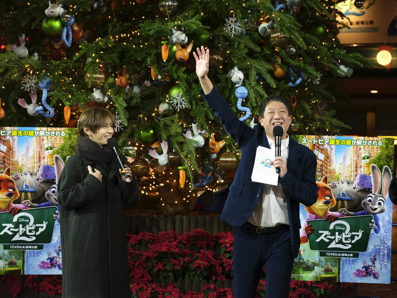 イベント会場となったセレブレーション・プラザの大型クリスマスツリーにも、ジュディやニックの装飾が使用されている。イベント直前にサプライズへの意気込みを聞かれたふたりは、「ここからどんどん盛り上げていきたいなと思ってます!山田くんの力で爆発させてください!」(高橋)、「頑張るしかないですね!このイベントを皮切りに、『ズートピア2』をたくさんの方に知っていたけるように頑張っていきたいです!」と意気込みを語った。