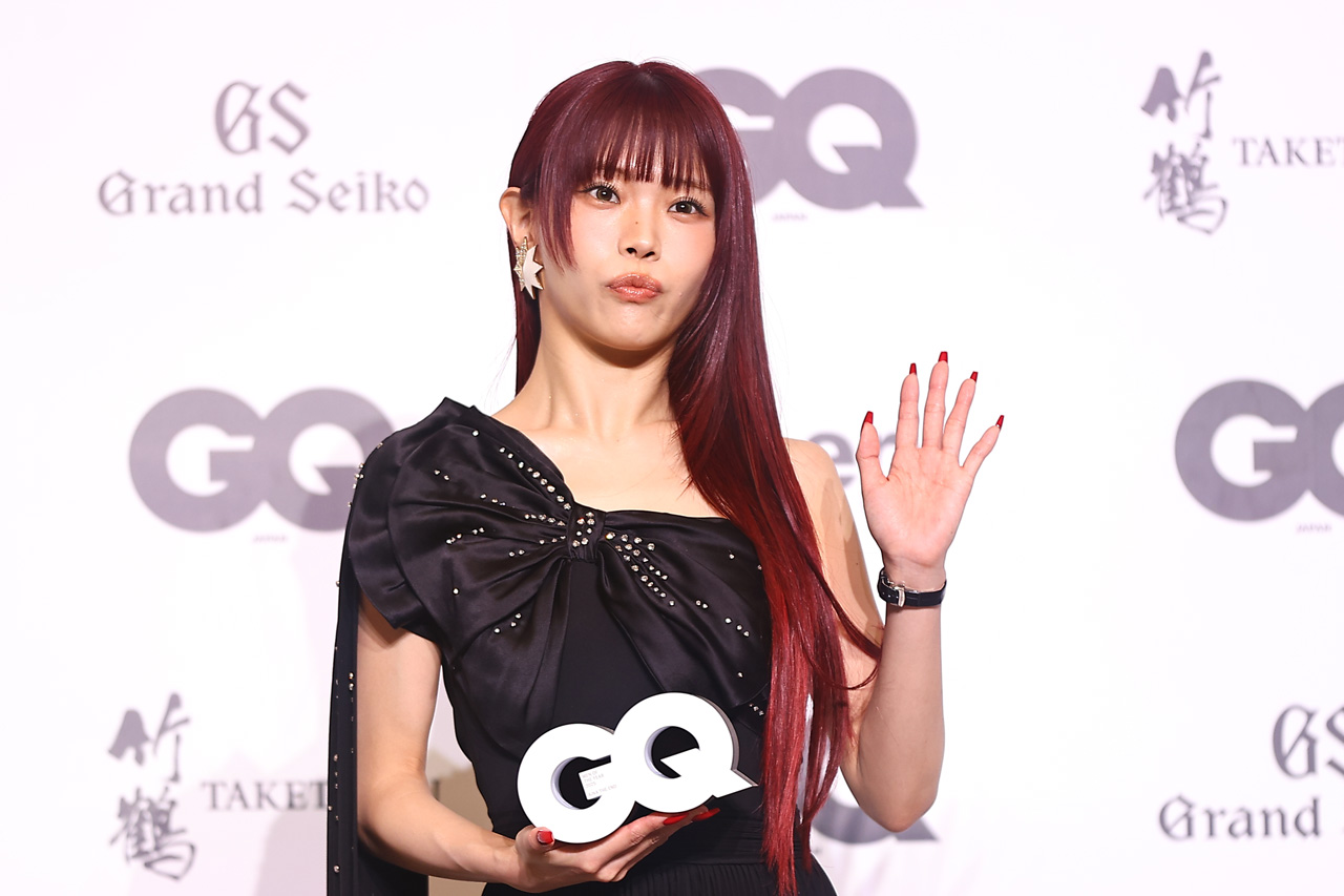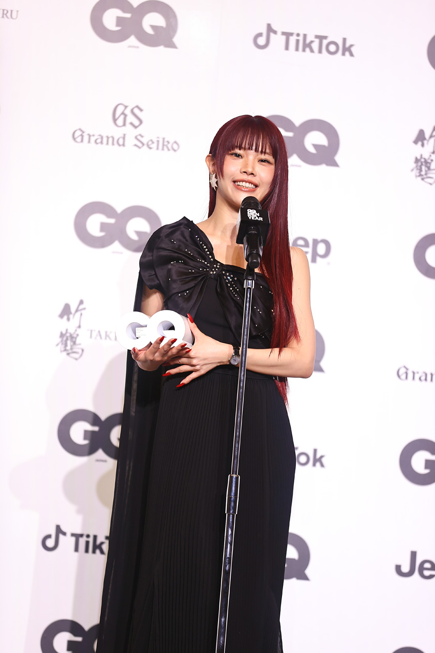 黒のワンショルダードレス姿で現れたアイナ。今回の受賞に「『GQ JAPAN』さんには以前、ソロとして表紙を飾らせて頂いたんですが、そのときまでファッションの面白さを感じていなかったんです。その表紙を飾らせて頂いたときに面白いなと思って、あれから時を経てこうしてお世話になる機会があってありがとうございます!」と、気持ちを語った。