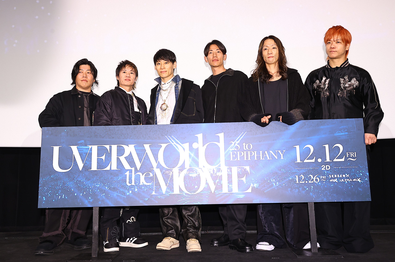 ロックバンド『UVERworld』のTAKUYA∞、彰、克哉、信人、真太郎、誠果が12月11日に東京・新宿バルト9でドキュメンタリー・ライブフィルム『UVERworld THE MOVIE: 25 to EPIPHANY』(監督:オ・ユンドン イ・イェジ/配給:エイベックス・フィルムレーベルズ)前夜祭!公開記念舞台あいさつに登壇した。