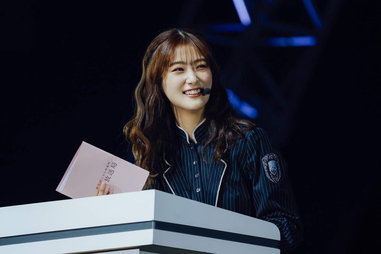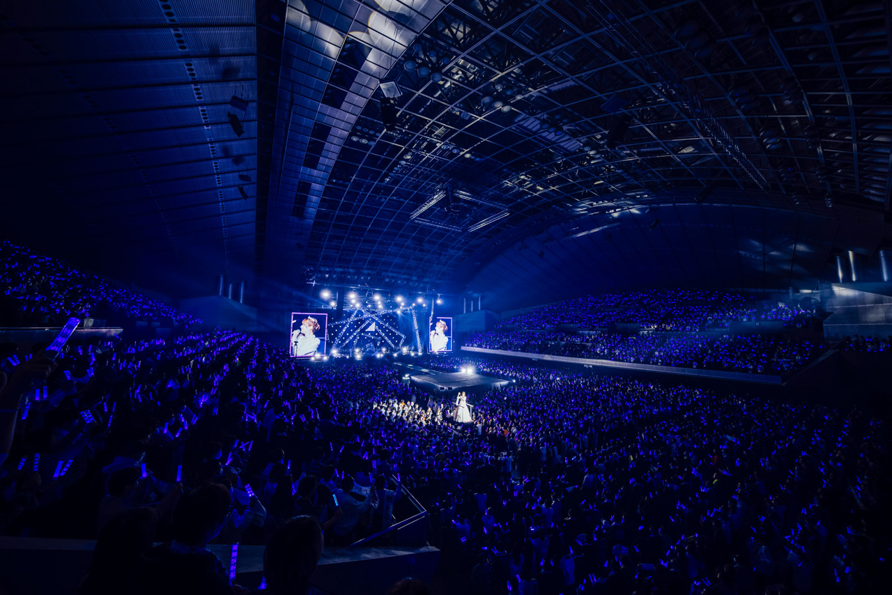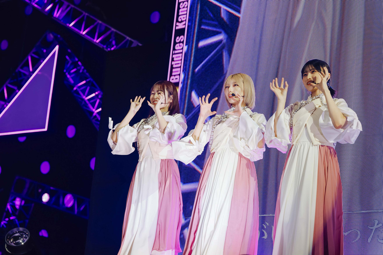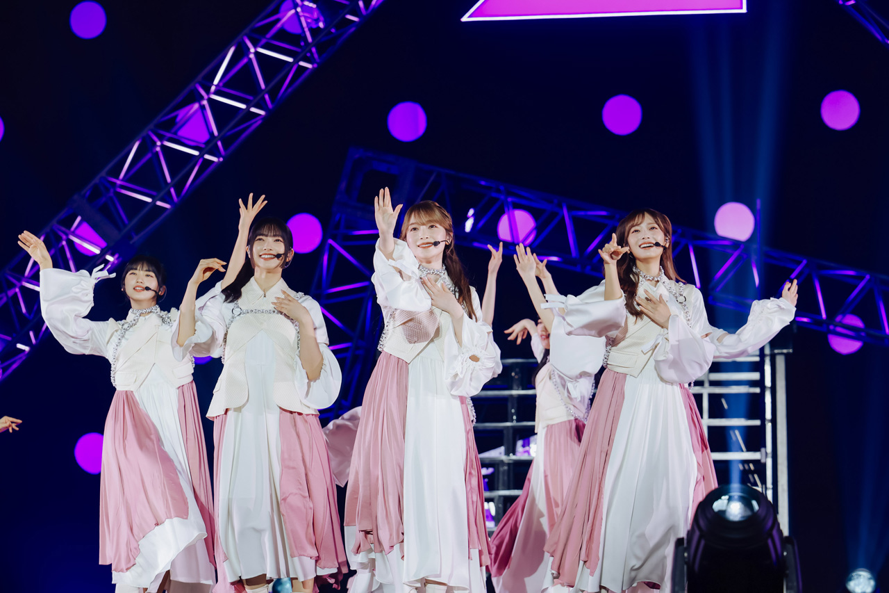 最後の最後まで安定しない活舌の井上のトークに場が和んだあとは、ライブパートへ突入。客席が井上のペンライトカラーである青1色に染まる中、久しぶりに披露される「Microscope」にてライブは幕を開ける。井上を含むオリジナルメンバーに三期生を加えた編成で、柔らかさや可愛らしさを打ち出したパフォーマンスで会場を幸福感で包み込むと、続く「桜月」では桜色に染まった客席を前に、美しさや儚さを漂わせた歌とダンスでBuddiesを魅了してみせた。