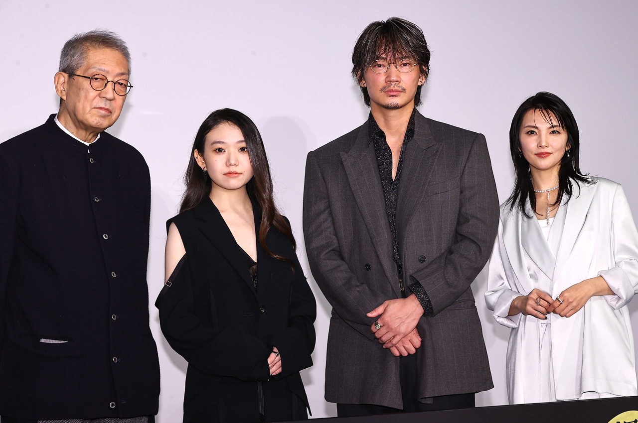 俳優・綾野剛、咲耶、田中麗奈が12月19日に東京・テアトル新宿で映画『星と月は天の穴』(監督:荒井晴彦/配給:ハピネットファントム・スタジオ)初日舞台あいさつを荒井晴彦監督とともに開いた。