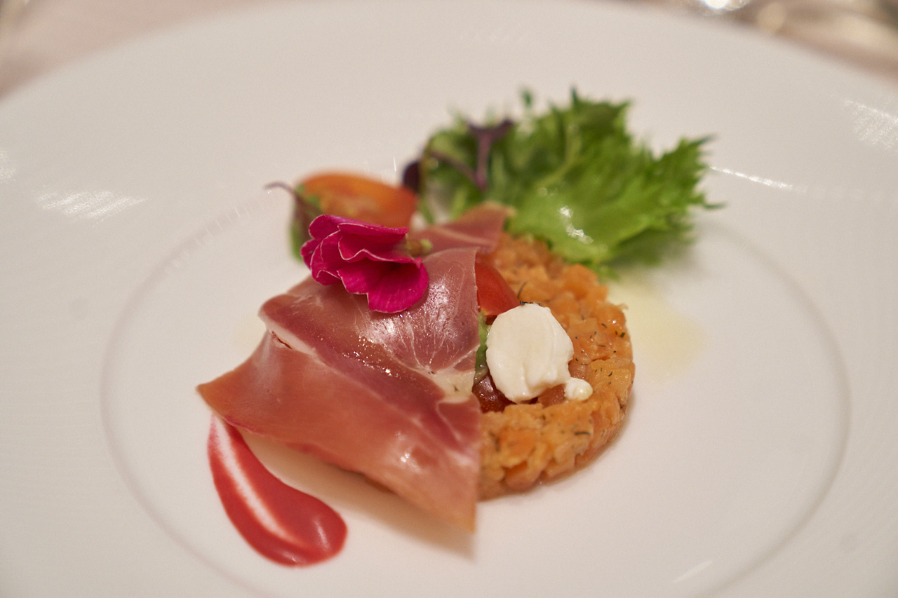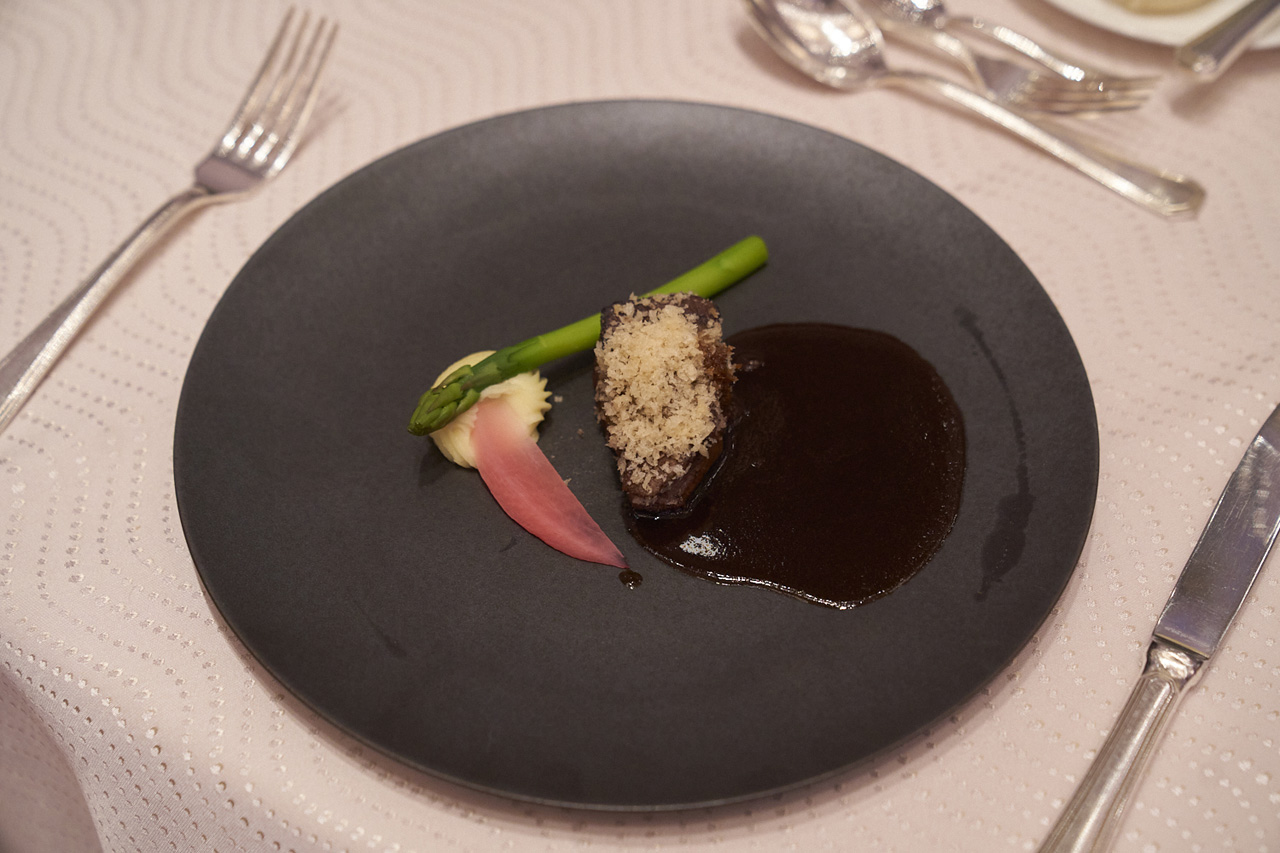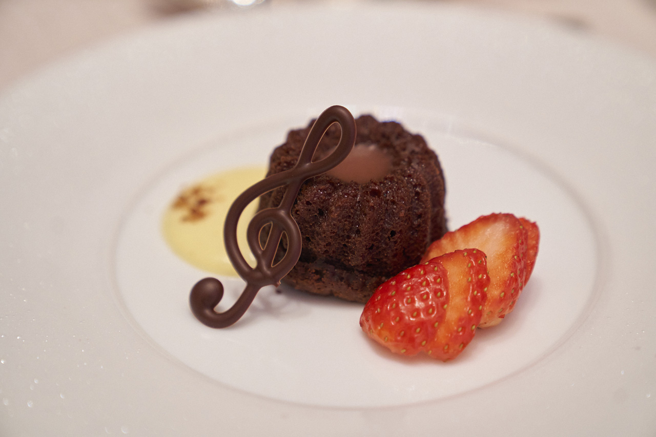 続いて、コックコート姿のガンダムパイロットたちが、本日提供されるスペシャルメニューを紹介するコーナーへ。前菜は、トロワがステージで使うピエロの仮面をイメージした『生ハムの仮面を付けたトラウトサーモンのタルタルにモッツアレラチーズのカプレーゼをしのばせて』 。トロワの「食べ終わったあと、もし気にいってくれたなら、拍手とブラボーをお願いする」というメッセージに、すかさずカトルが「半分の仮面だけでも、もうブラボーですよ」と答え、二人の仲の良さがうかがえるやりとりも。スープは、五飛の遠い故郷を思い起こさせる『ズワイ蟹入りフカヒレスープ アルトロングリーンソース仕立て』。「ソースがオレのイメージカラーであるところのグリーンをアピールしているのだ!」という五飛の圧の強いコメントに続き、ヒイロが紹介するのは、チコリーをウイングガンダムゼロの羽根に見立てたメインディッシュ『真鯛のソテー ブールブランソース チコリーのウイング』。ヒイロが、このメニューに『新機動戦記ガンダム W Endless Waltz』での名セリフから『確認する…シェルターは完璧なんだな? シェルターは完璧なんだな?』と命名したことを明かすと、会場から笑い声があちこち上がっていた。もう一つのメインディッシュはデュオが紹介。『牛フィレの肉のポワレ モンドール風 デスサイズの鎌に見立てた野菜添え芳醇なマデラワインソース』も、デュオが勝手に『天国への招待状』と命名したと告げた。そして、最後のデザートはカトルをイメージした『フォンダンショコラ デュカスパイス香るアングレーズソース 音符のしらべ』。ト音記号のチョコが、音楽好きな彼のために添えられたとのことで、カトルは、シェフとパティシエへの感謝を述べた。