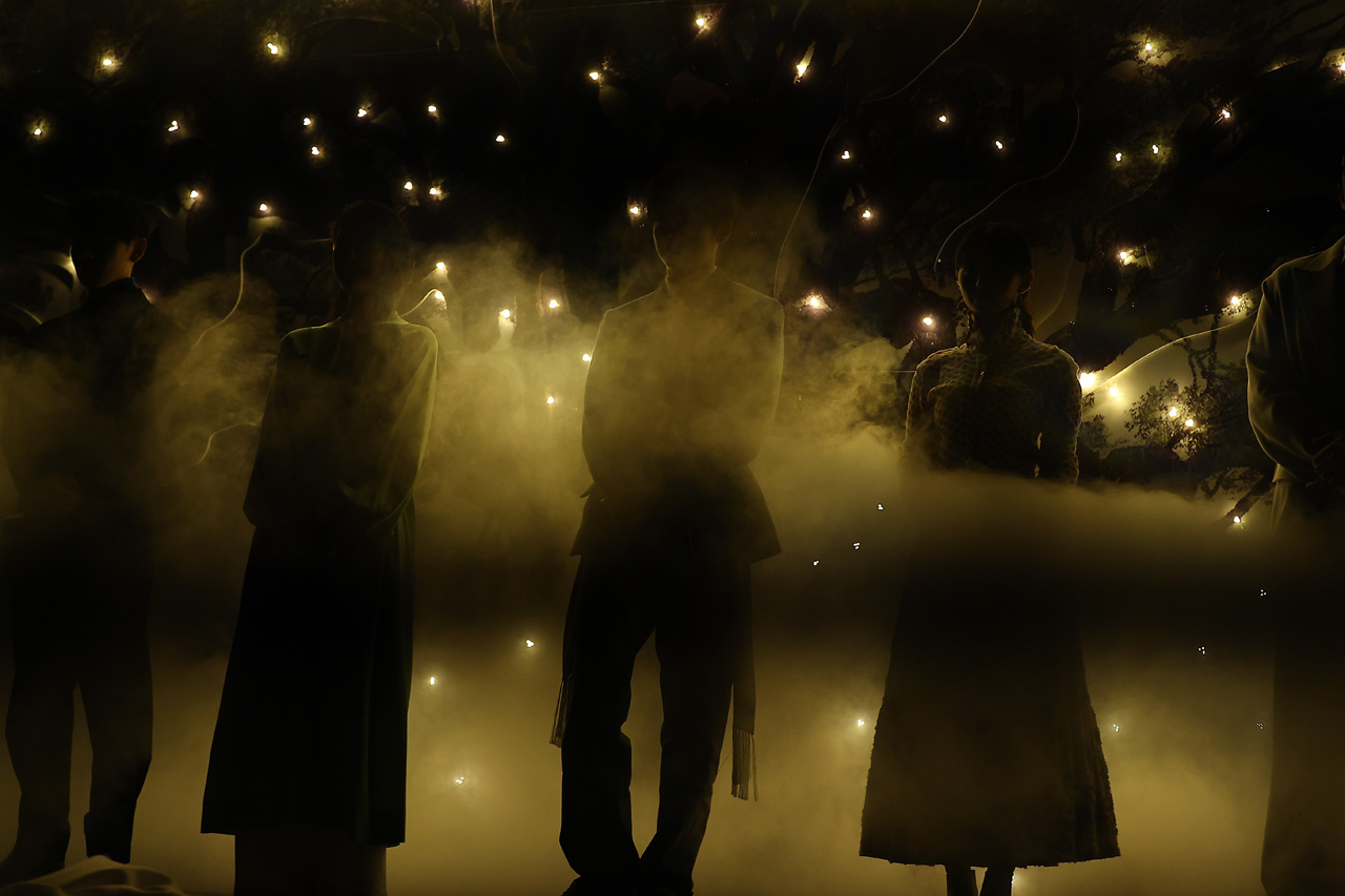 ステージには白幕が張られ、それがベールアウトされシルエット状態になったキャスト陣が板づいてド派手に登場。