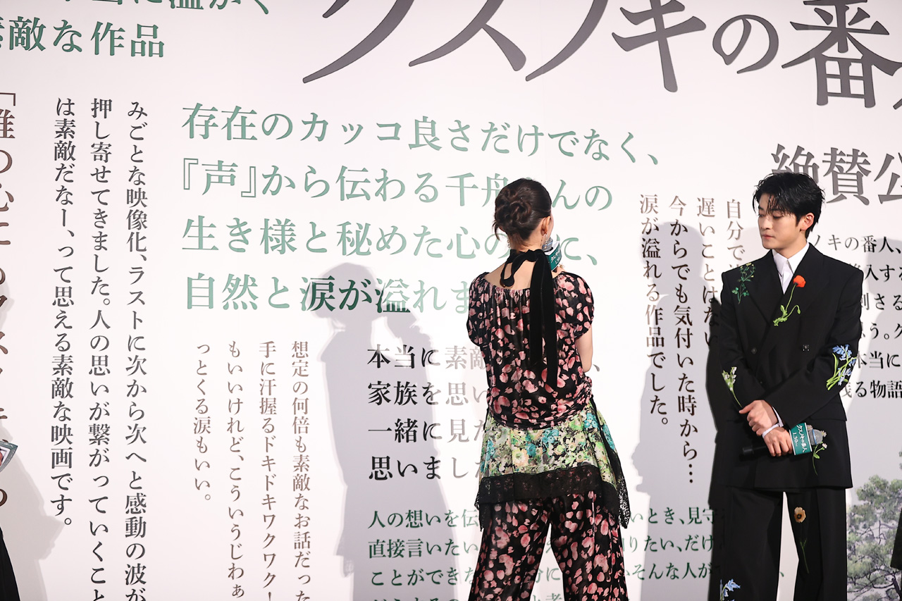 会場には先行試写会で観た方のメッセージなどがバックパネルにかかれており、絵の綺麗さに心惹かれた方が居たり、クスノキの描写も素晴らしかったという声に「もちろん東野さんの文章で読んでイメージは湧くんですけど、実際に映像を観ると圧倒されるものがあるんです。集まったキャストのみなさんも素晴らしいし、絵と音楽を作って頂いて、そうして届いているんだなと感じています」とアピールも兼ねて話を展開した。