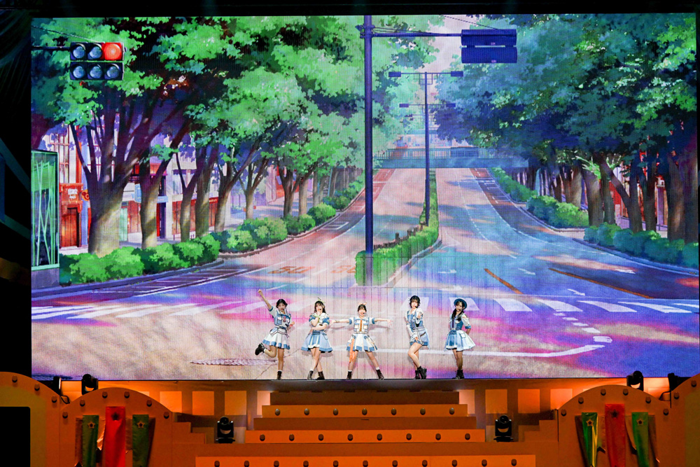 終盤は『OPEN THE G☆TE!!!』のジャケットの衣装で1期生の伊達、Liyuu、岬、ペイトン、青山の5人が飛び出してくる。『ラブライブ!スーパースター!!』の初期ティザービジュアル背景が大スクリーンに映し出されるなか、5人がティザービジュアルの中から飛び出してきたように見える遊び心や、そこからのTVアニメ第1期OP『START!! True dreams』、2期生の4人も加わってのTVアニメ第2期OP『WE WILL!!』、全員での『Jump Into the New World』と3曲をメドレーのようにショートサイズで披露していた。