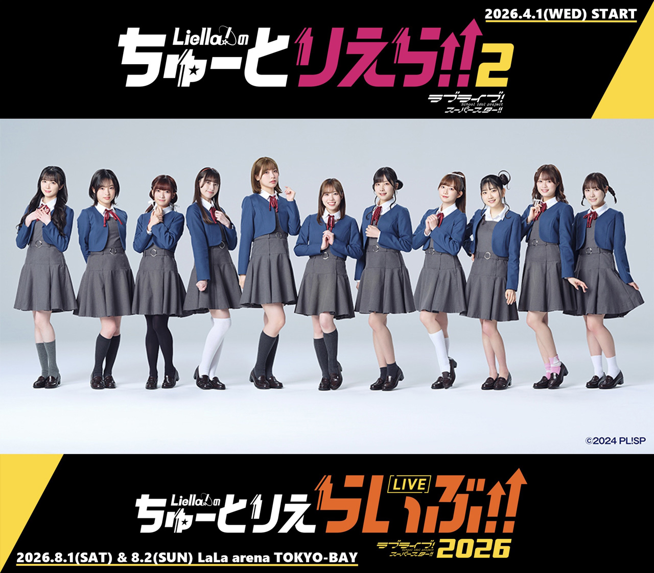3つ目は2025年4月から全5回で放送された冠番組『Liella!のちゅーとりえら!!』が『Liella!のちゅーとりえら!! 2期』(日本テレビ)となって今年4月1日24時59分より放送が決定したことを発表(TVer、日テレ無料(TADA)では地上波番組放送後より見逃し配信も実施)。MCは引き続き『タイムマシーン3号』が務め、今回は全10回と前回の倍の話数を用意していることや、8月1日と8月2日にLaLa arena TOKYO-BAYで番組ライブイベント『「ラブライブ!ス―パースター!! Liella!のちゅーとりえらいぶ!! 2026』を開催予定であることが明かされた。