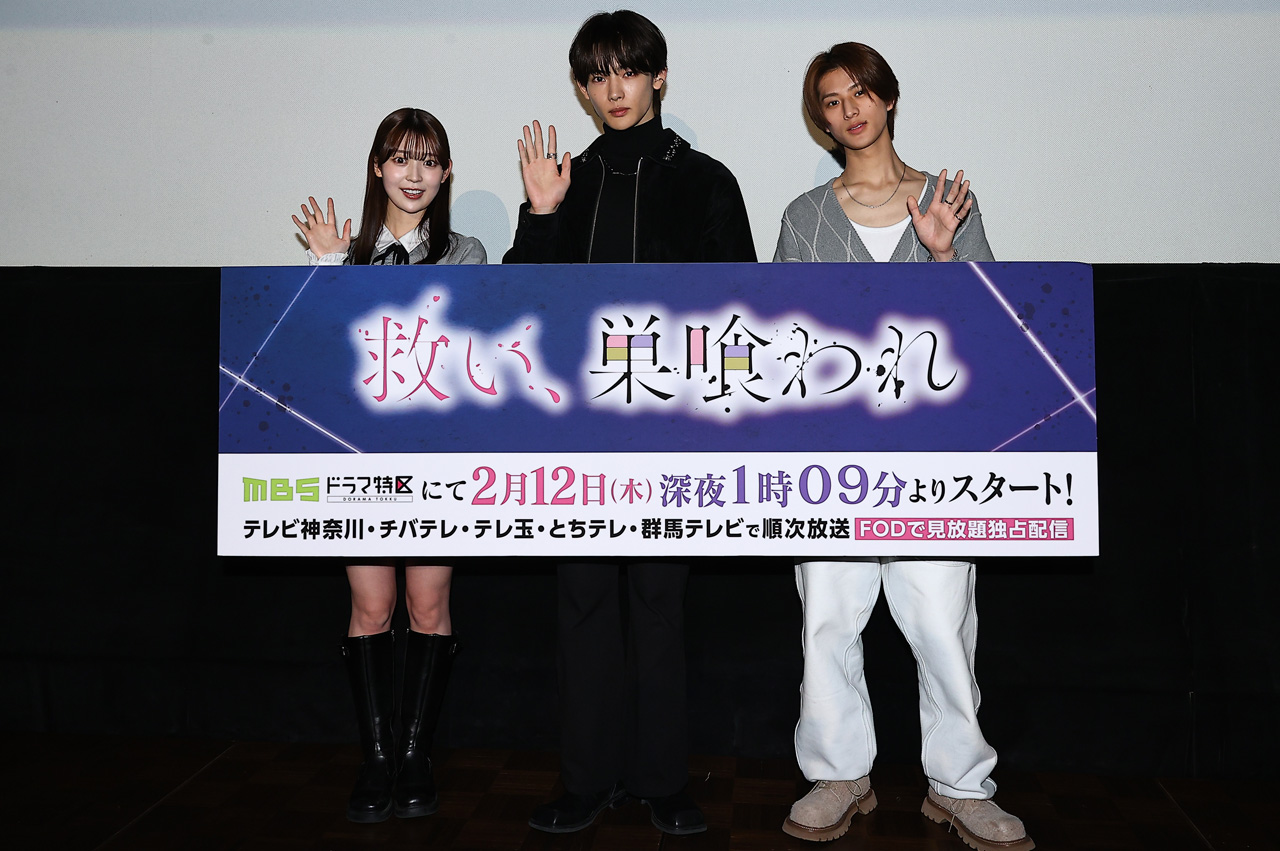 アーティストで俳優・NOA、元『乃木坂46』阪口珠美、『ICEx』阿久根温世が2月12日に東京・池袋HUMAXシネマズでドラマ特区『救い、巣喰われ』1話先行上映会&トークイベントを開催した。