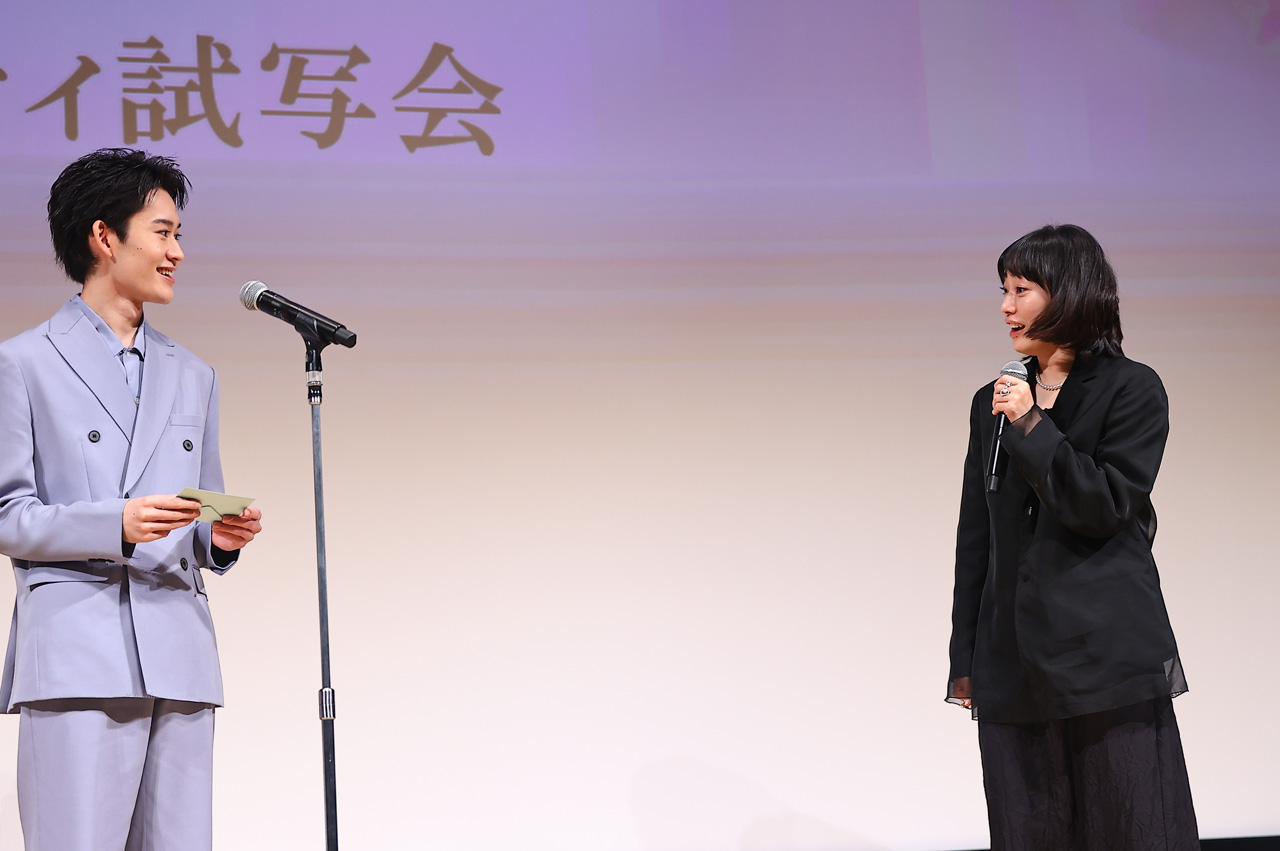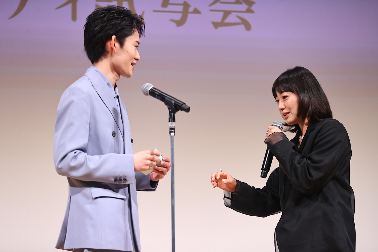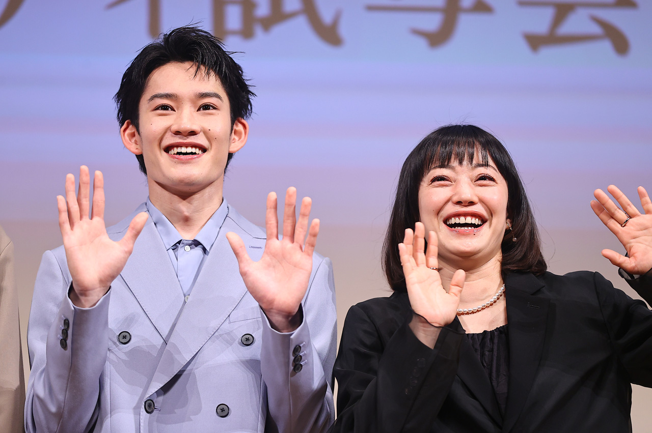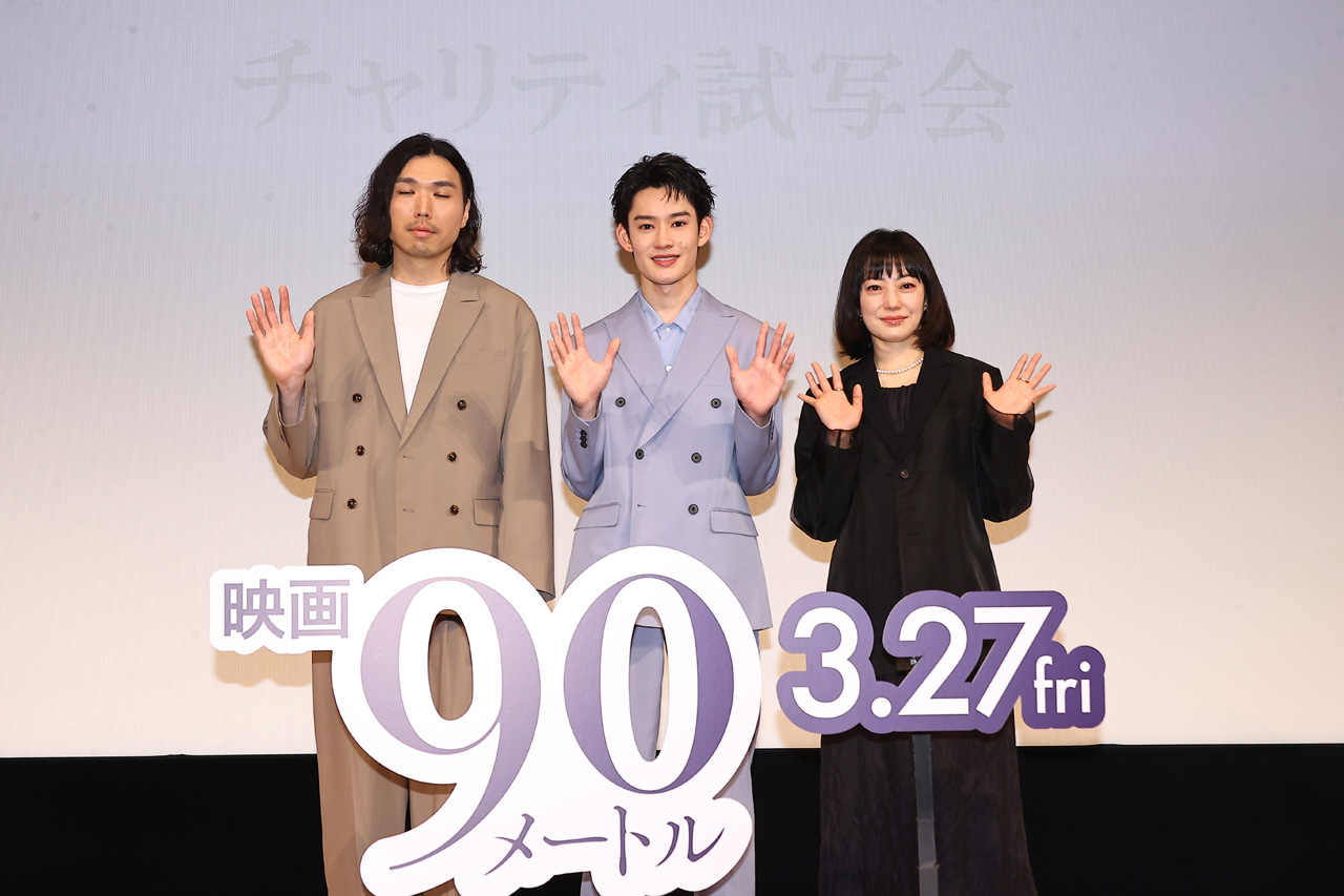 俳優・山時聡真、菅野美穂が3月17日に東京・虎ノ門のニッショーホールで映画『90メートル』(監督:中川駿/配給:クロックワークス)チャリティ上映会を中川駿監督とともに開いた。