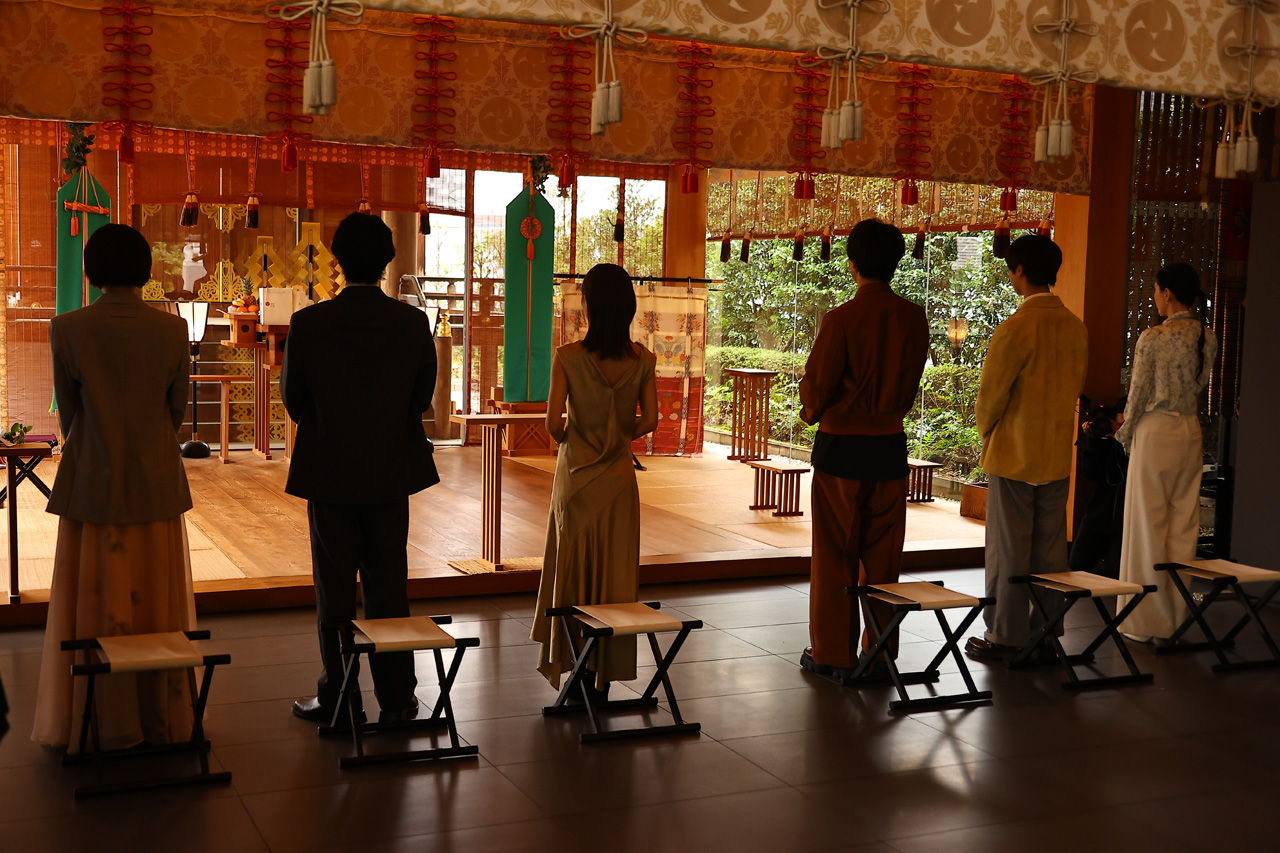 会見前に大ヒットを願ってご祈祷が厳かに執り行われ、それぞれ神妙に願いを込めた。