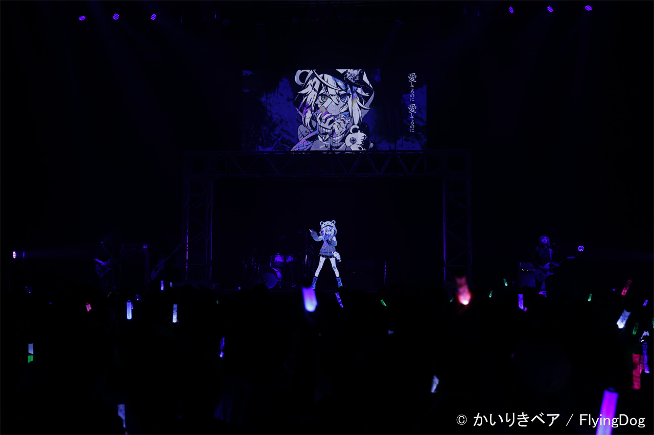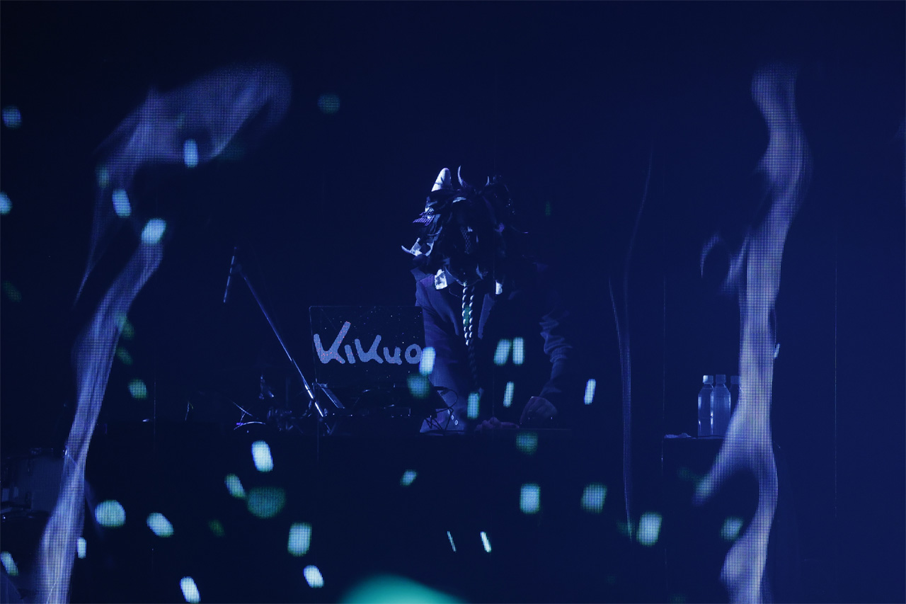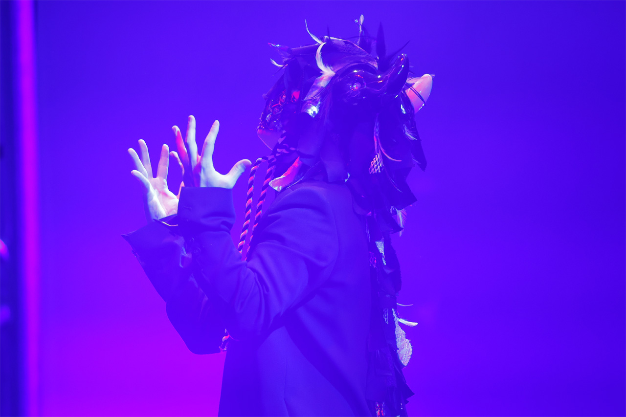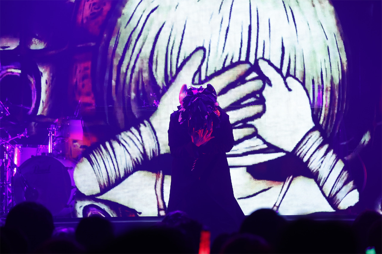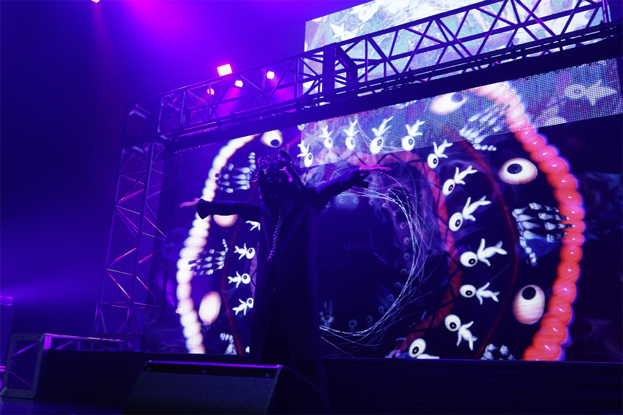 歪んだ感情をそのまま具現化したかのような映像と、爆発的なエネルギーを内包したサウンドが重なり合い、会場には唯一無二の空気が形成されていく。